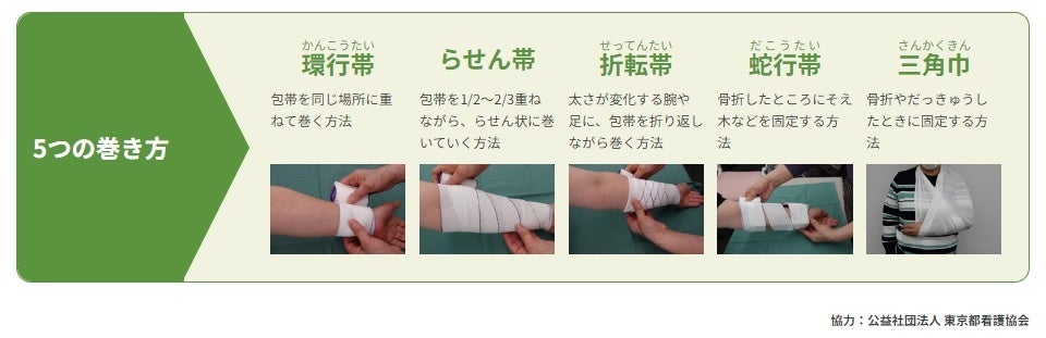 ケガをしたときにすぐできる手当として包帯法があります。5つの方法を体験しながら学びましょう。