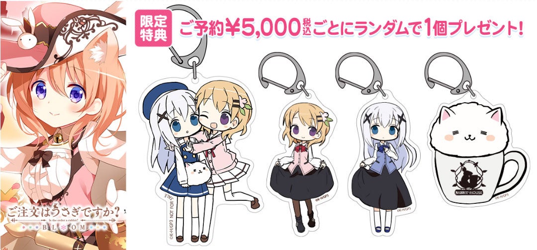 「ご注文はうさぎですか?」対象商品のご予約¥5,000(税込)ごとにミニアクリルキーホルダー(約80mm/イラスト:ユキヒ)がランダムで1個もらえる!