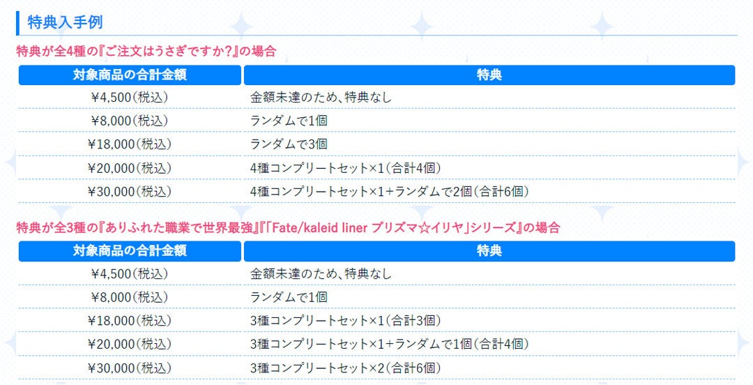 ・『ご注文はうさぎですか?』対象商品を一会計¥20,000(税込)以上お買い上げで、限定特典コンプリートセット(全4種類)がもらえます。