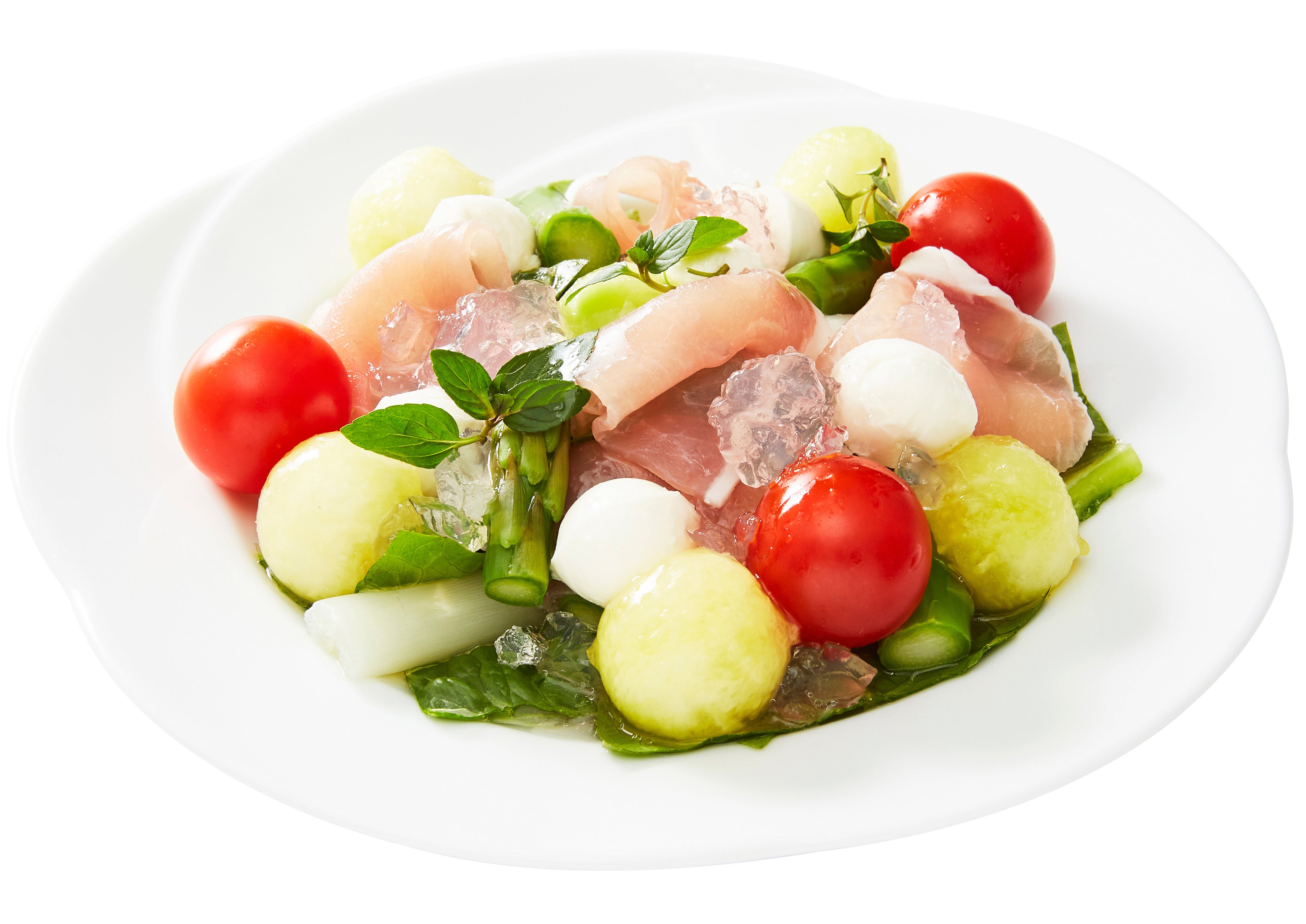 2色のアスパラにマスクメロンと生ハムを合わせサラダに仕立てました。