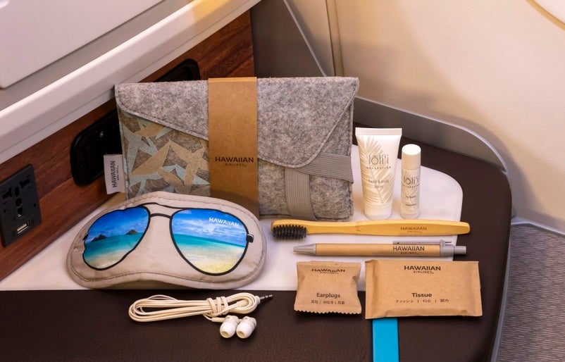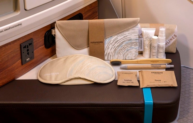 責任ある調達方法により集められた素材を使用したアメニティは、11月6日より長距離国際線およびハワイ-ニューヨーク、ボストン、オースティン線のビジネスクラスにて提供されます。プラスチックをリサイクルした生地で作られたキャンバスバッグには必要最低限のアイテムのみが入っており、追加で必要なアメニティ各種はご要望に応じて提供することで廃棄物を最小限に抑えます。
