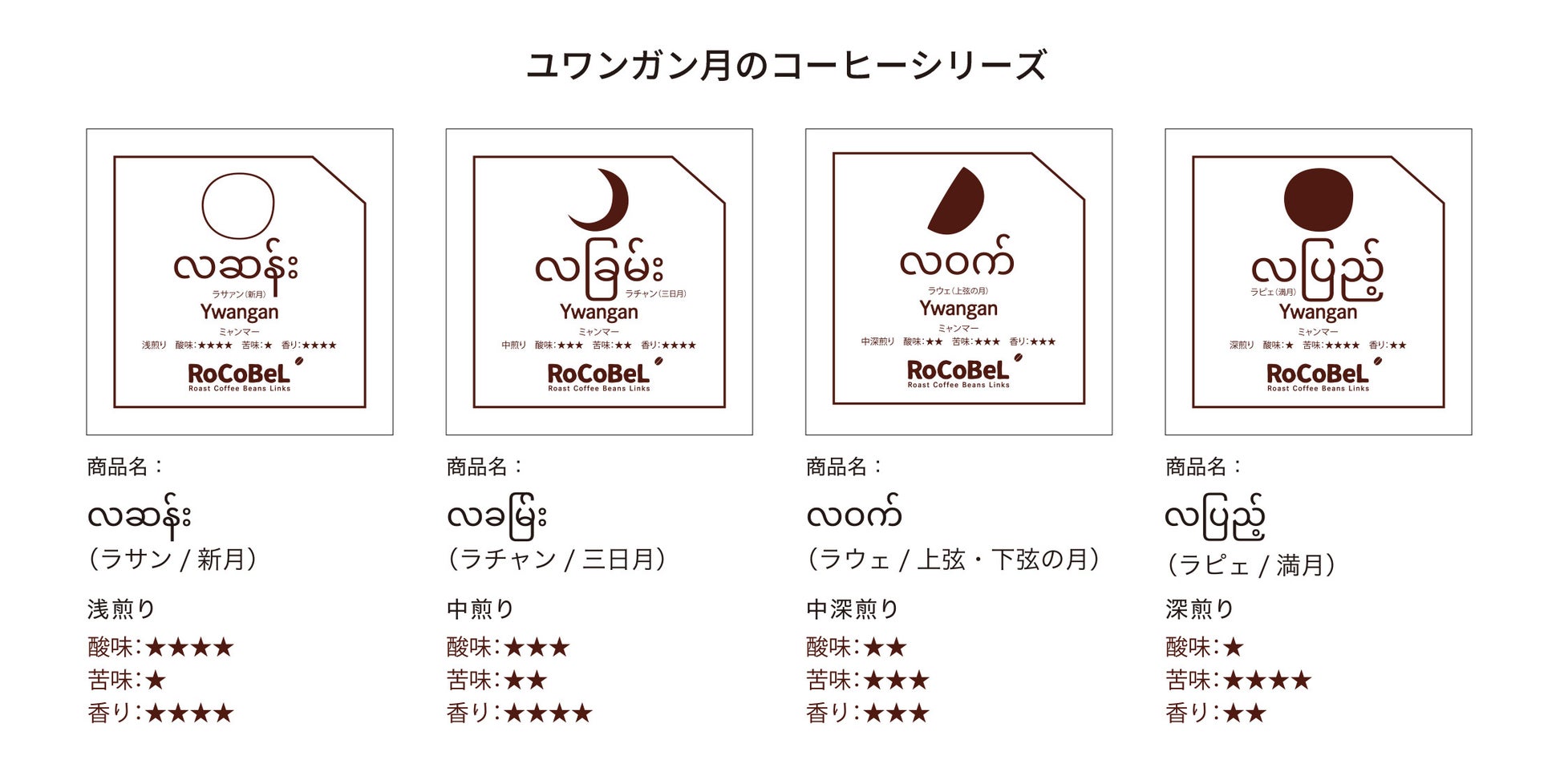 艶やかで滑らか、重厚な味わいをお伝えしたく、ネーミングも少し、くどくて長いかもしれませんが、「Myanmar Extra Royal Rich Blend」シリーズとしました。「ミャンマーの満月シリーズ」と覚えてください。このブレンドはユワンガン月のコーヒーシリーズの「ラピェ(満月)」をベースとした派生ブレンドです。ですから、それぞれのブレンドにミャンマーの満月の名前をつけました。