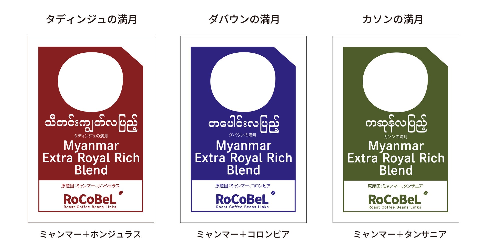 そこで、2024年10月からロコベル がこれまでの「フィジビリティ・スタディ(実証実験)のフェーズ」から「ビジネスへの移行フェーズ」に切り替わったことを機に、新商品を企画。深煎りしたミャンマー(ユワンガン)の豆「ラピェ(満月)」に、ホンジュラス、コロンビア、タンザニア(一般にはキリマンジェロと呼ばれています)をそれぞれ深煎りにしてブレンドした新しいブレンドコーヒーを発売することにしました。