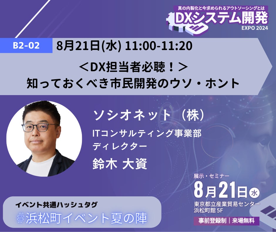 この度、ソシオネット株式会社(本社:東京都品川区、以下「ソシオネット」)は、『DXシステム開発 Expo 2024』において、『<DX担当者必聴!>知っておくべき市民開発のウソ・ホント』をテーマに、ITコンサルティング事業部ディレクターである鈴木が登壇することとなりました。
