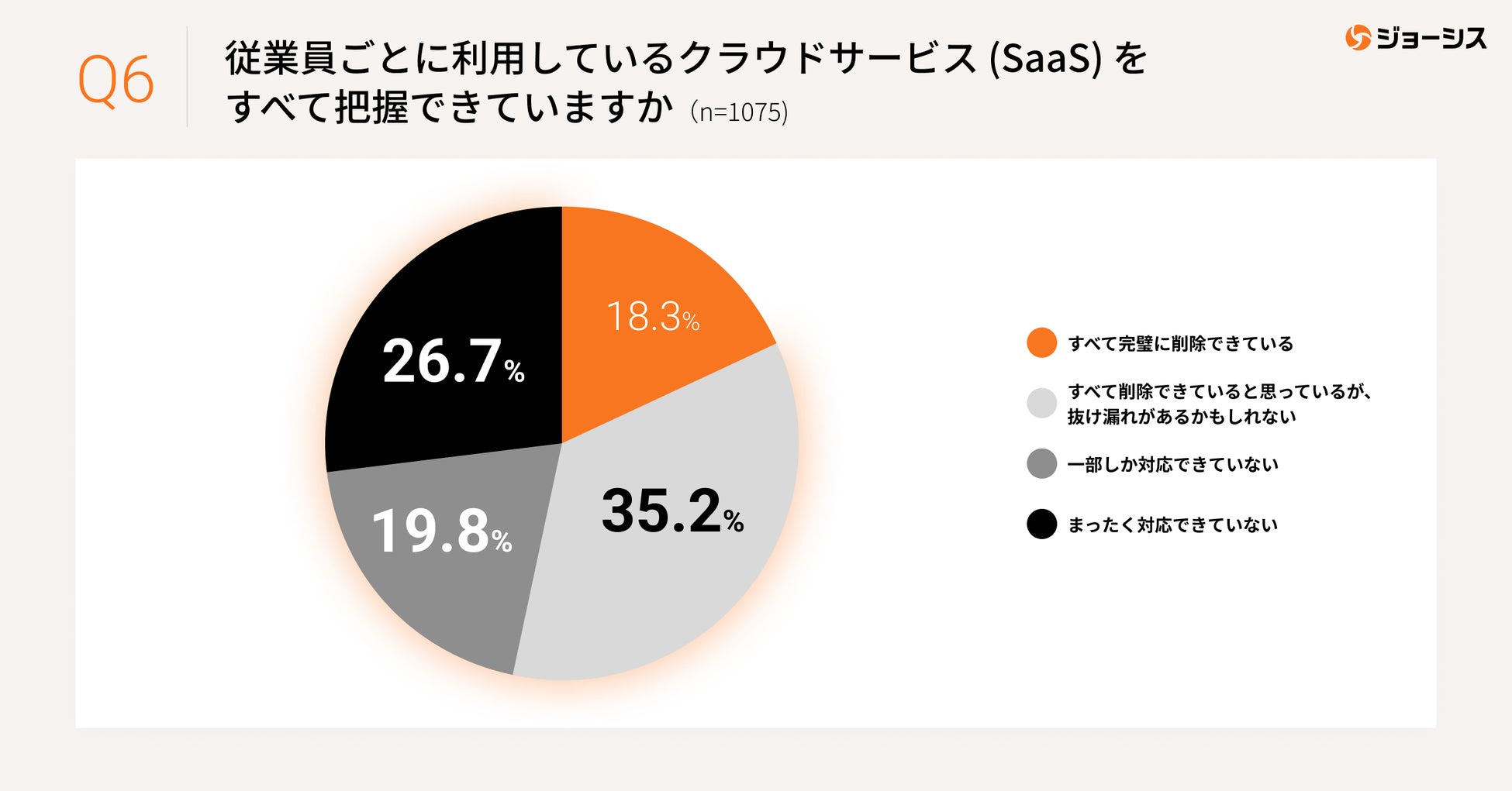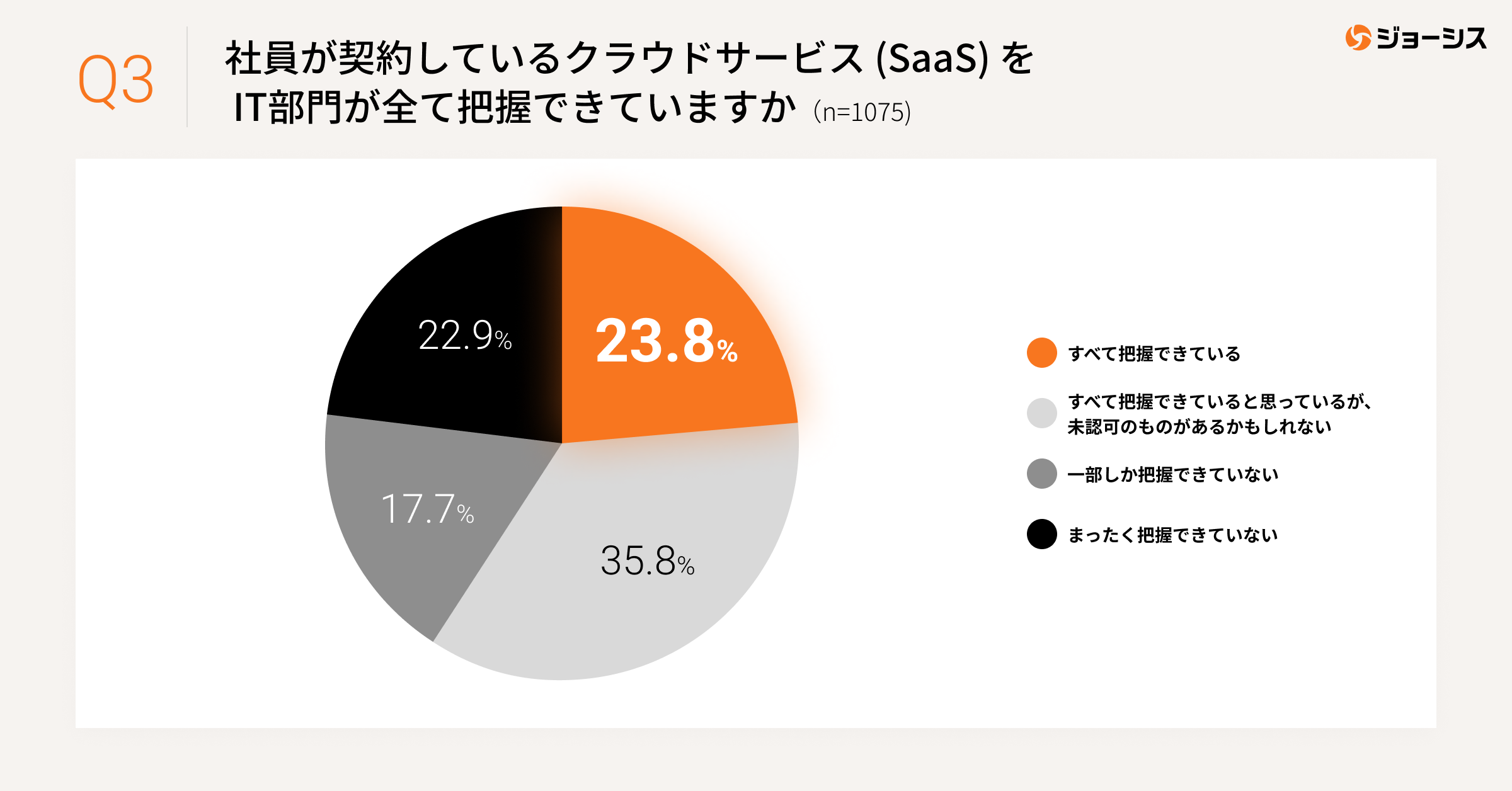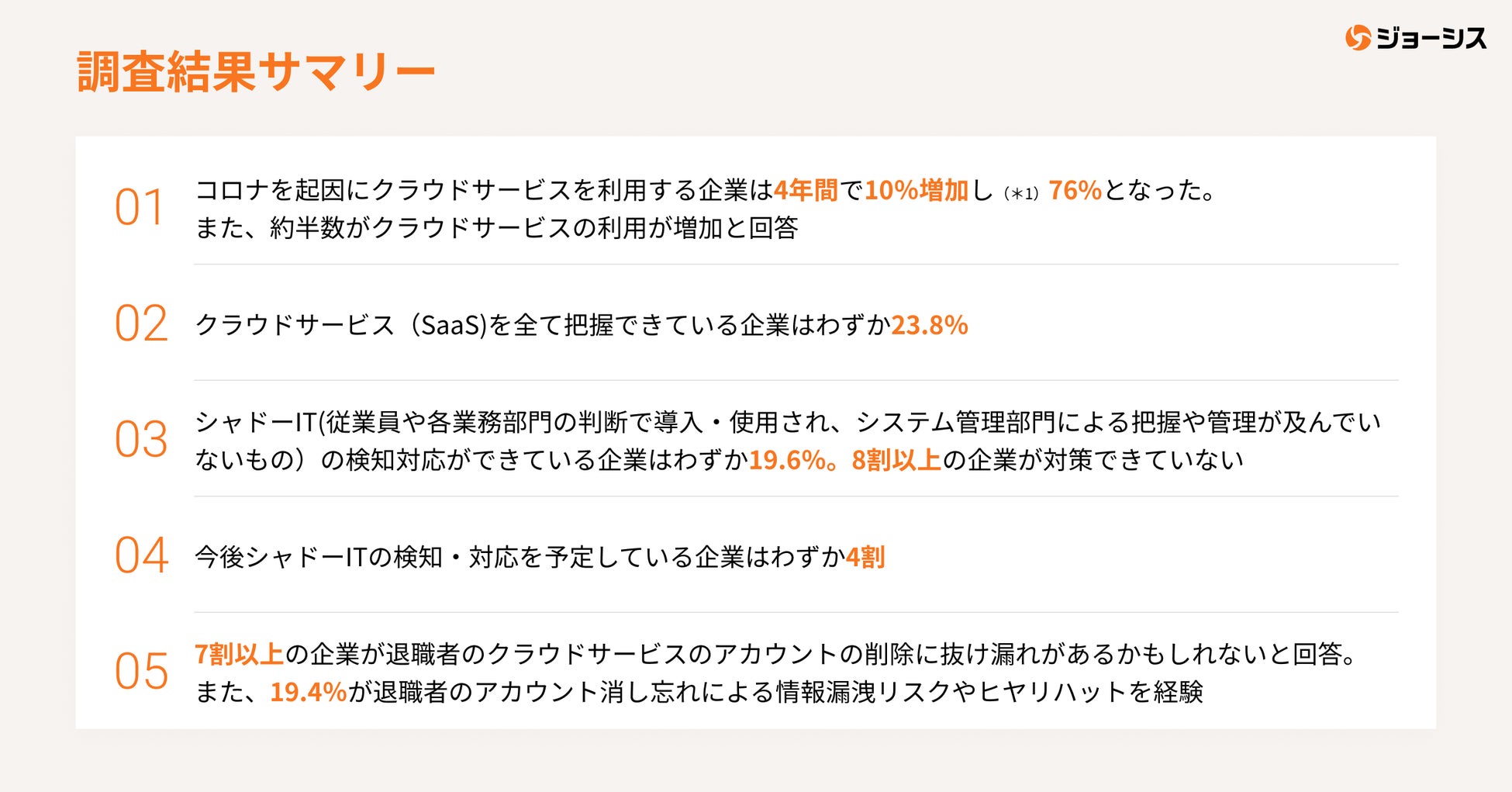 今回ジョーシスによる「IT管理の実態について」の調査結果から、急速にクラウドサービスの利用が進む中で各社の管理対策が不完全であり、情報セキュリティガバナンスに大きな課題があることが明らかになりました。