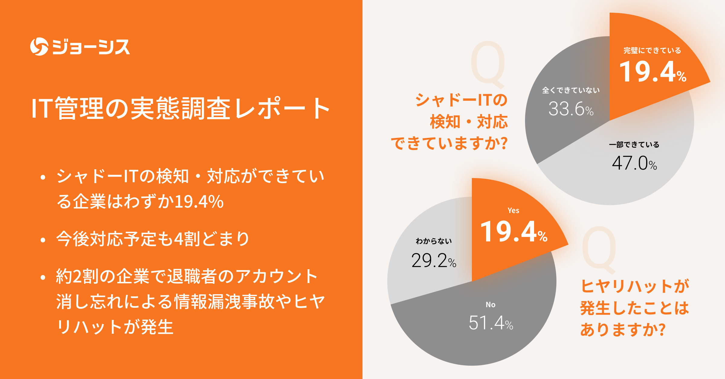 企業の情報セキュリティリスク対策に遅れ 「シャドーITの検知・対応ができている企業は19.4%、対応予定も4割どまり」「約2割の企業で退職者アカウント消し忘れによる情報漏洩やヒヤリハットが発生」