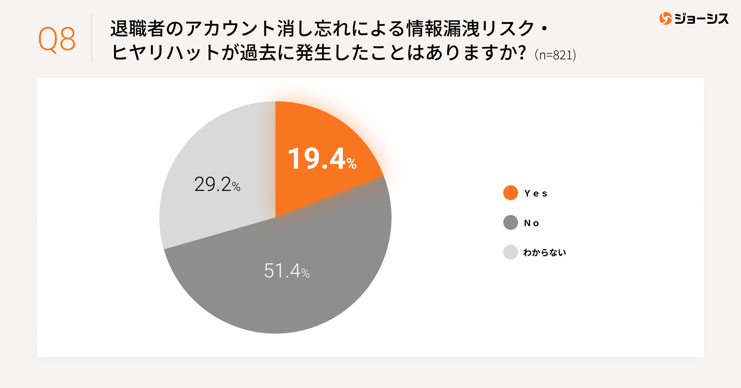 情報漏洩のリスク要因としては、中途退職者による漏洩(*3)が主な原因です。「退職者のアカウントを完璧に削除できている」という回答はわずか25%に過ぎず、7割以上の企業が不安を感じていることがわかりました。多くの企業がアカウント削除漏れにより、退職者による情報漏洩事故が発生してしまうリスクを孕んでいることになります。また、実際に約2割の企業で「情報漏洩リスク、ヒヤリハットの経験がある」という回答結果からも企業のセキュリティ対策が急務であるといえます。