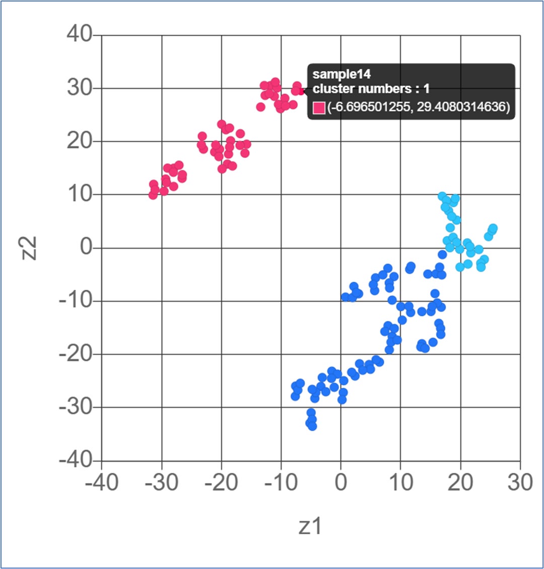 クラスタリングは、データのサンプルを類似性に基づいて適切なグループに分類する手法です。これにより、データを効率的に整理し、データ間の関係性や傾向を容易に把握できます。今回の可視化機能ではクラスタリングを用いて、例えば大量の実験データの中から、隠れた関係性を見える化し新たな知見を得たり、精度の高い予測モデルを構築するうえで前処理が必要な外れサンプルを検出したりすることで、一層の開発効率化に繋がります。