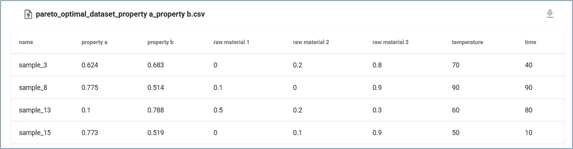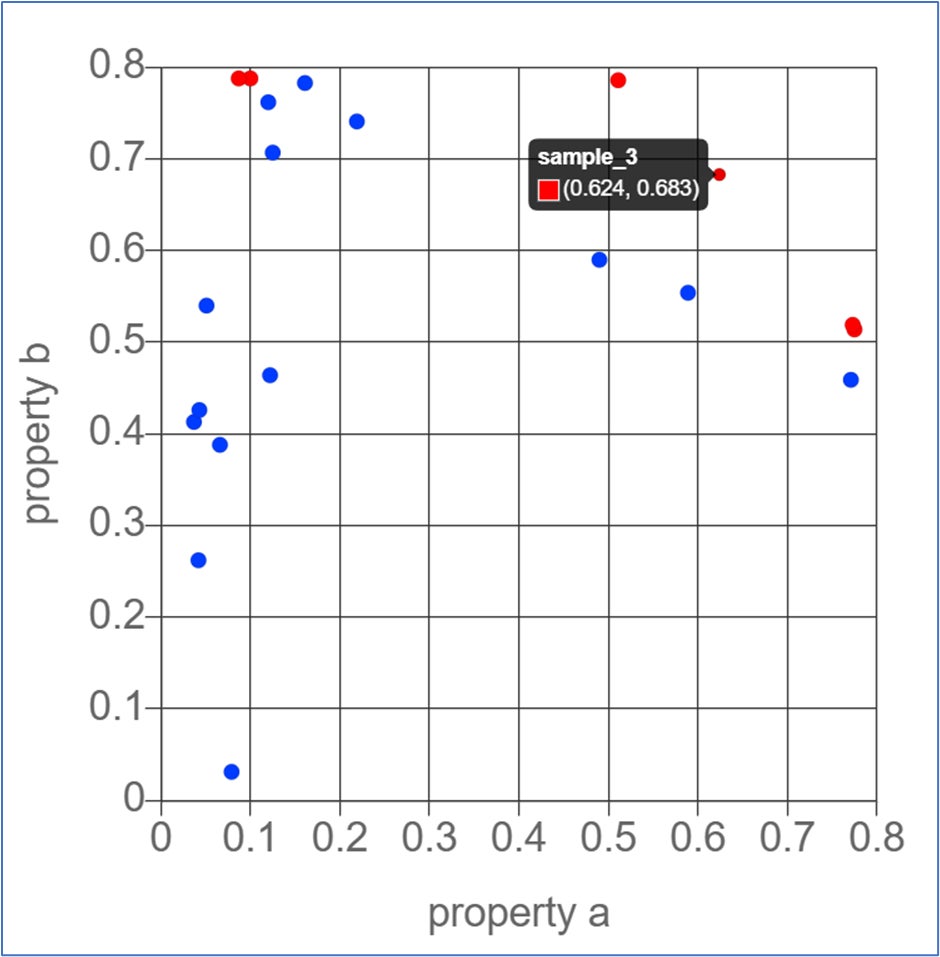 新規の材料を開発するプロセスにおいて、例えば、強度と柔軟性、耐久性とコストなど、相反する特性がある中で、最適な性能を示す材料の実験条件を探索することが多くあります。パレート最適解とはトレードオフ関係の中でそれ以上改善の余地のない最適な組み合わせの候補群を指します。今回の可視化機能では、例えばDatachemical LABにてAIにより算出された大量の未知の実験条件の予測結果の中から、相反する2つの特性においてパレート最適解が簡単に識別できます。パレート最適解をもとに、次に検討すべき実験条件が判断しやすくなります。