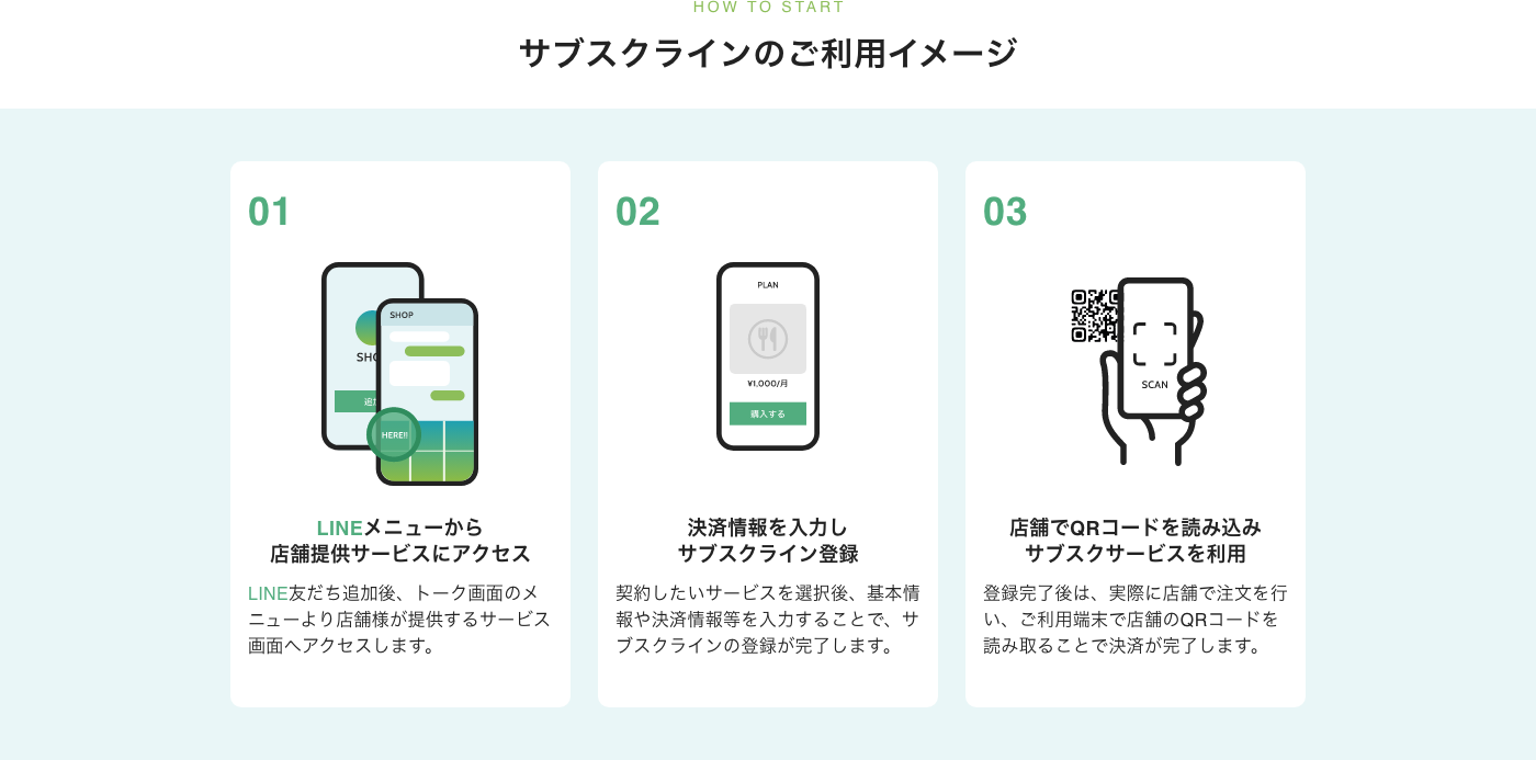 ・ユーザーは店舗のLINEアカウントを友達追加し、すぐにサブスクサービスの利用が可能。アプリダウンロード不要・WEB登録やメール送付も不要で、簡単にサブスクサービスを始められます。