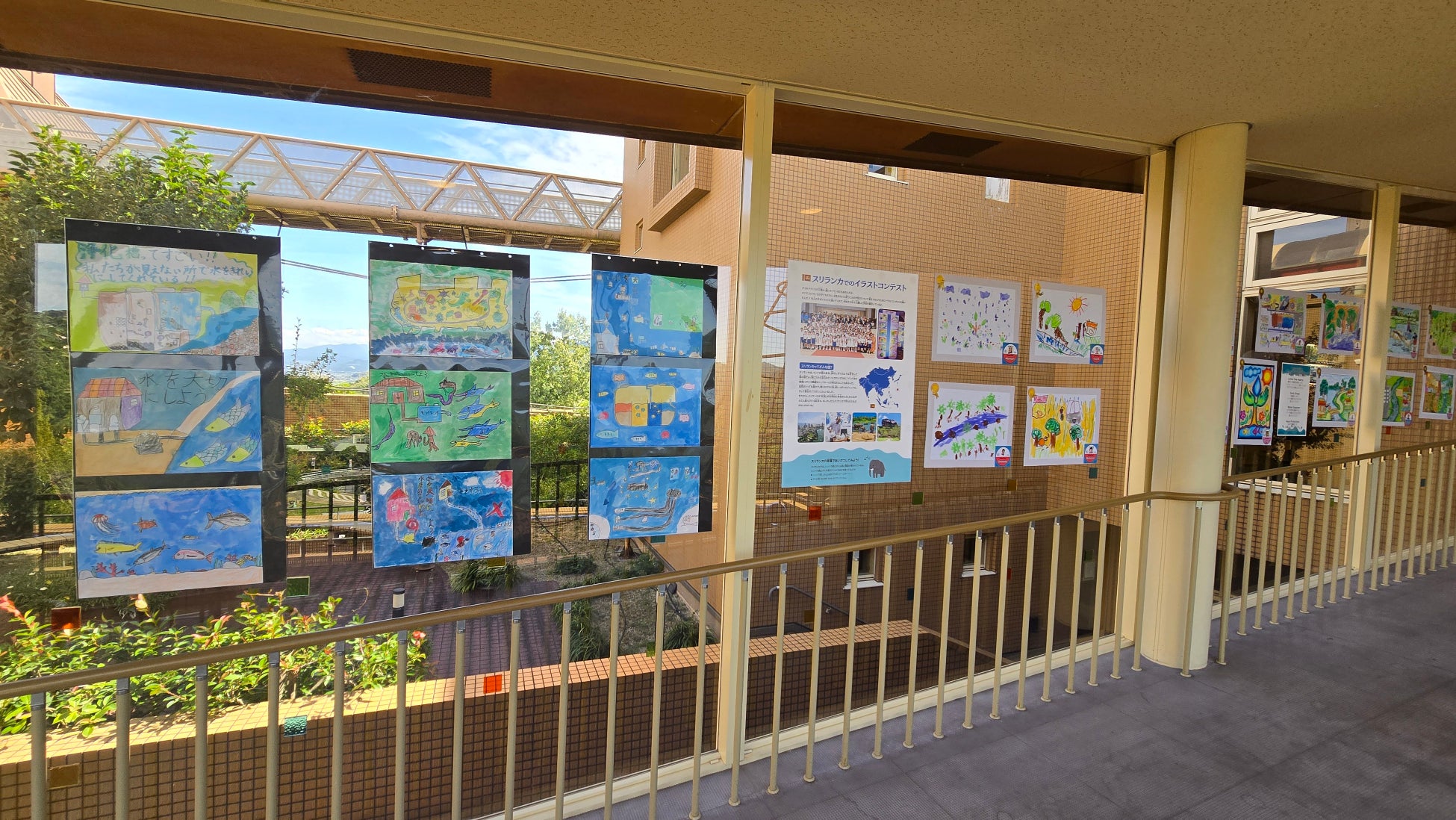 本展では、愛媛県宇和島市立鶴島小学校4年生と、スリランカの子どもたちが、「水環境」をテーマに描いたイラスト計49点を展示しています。