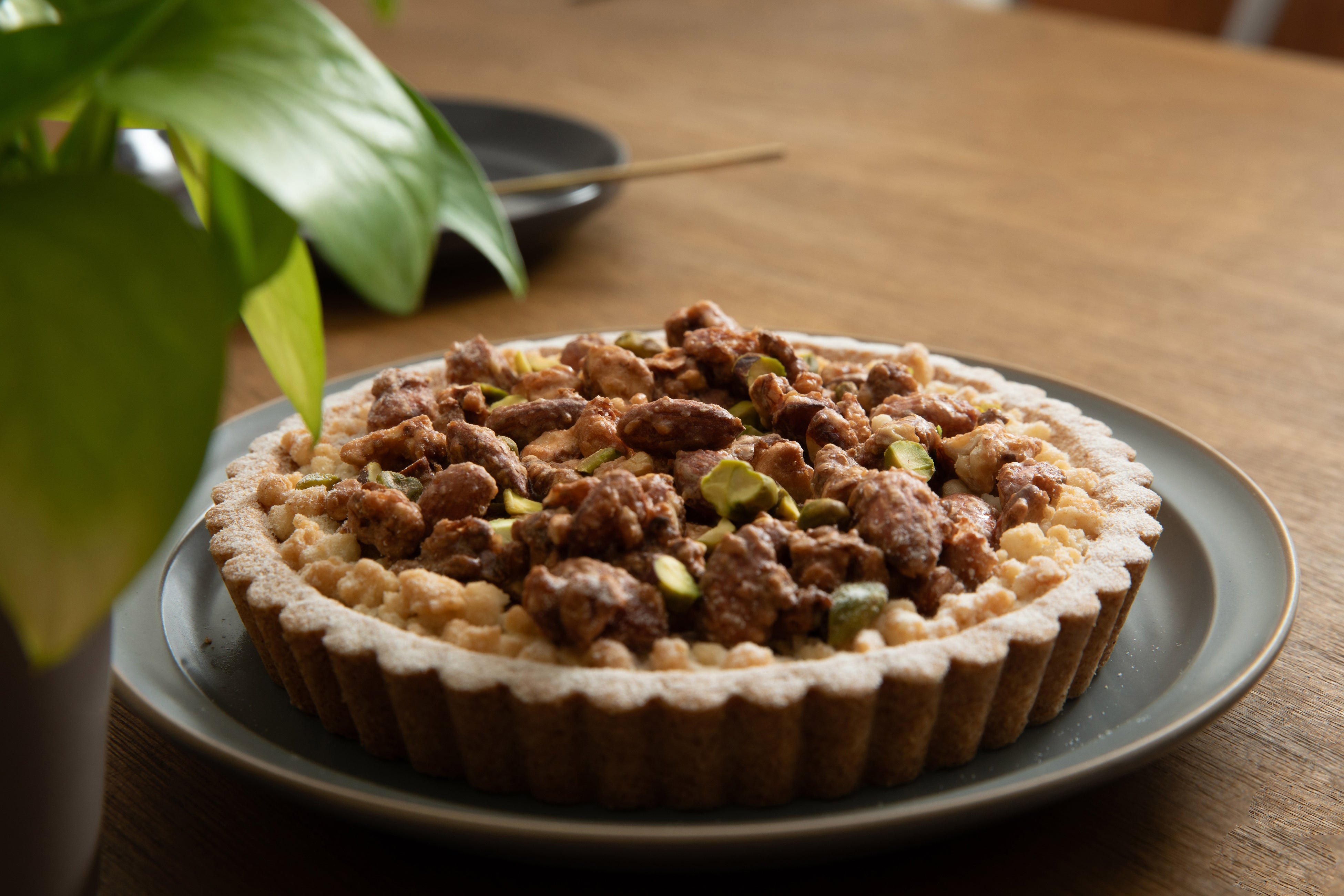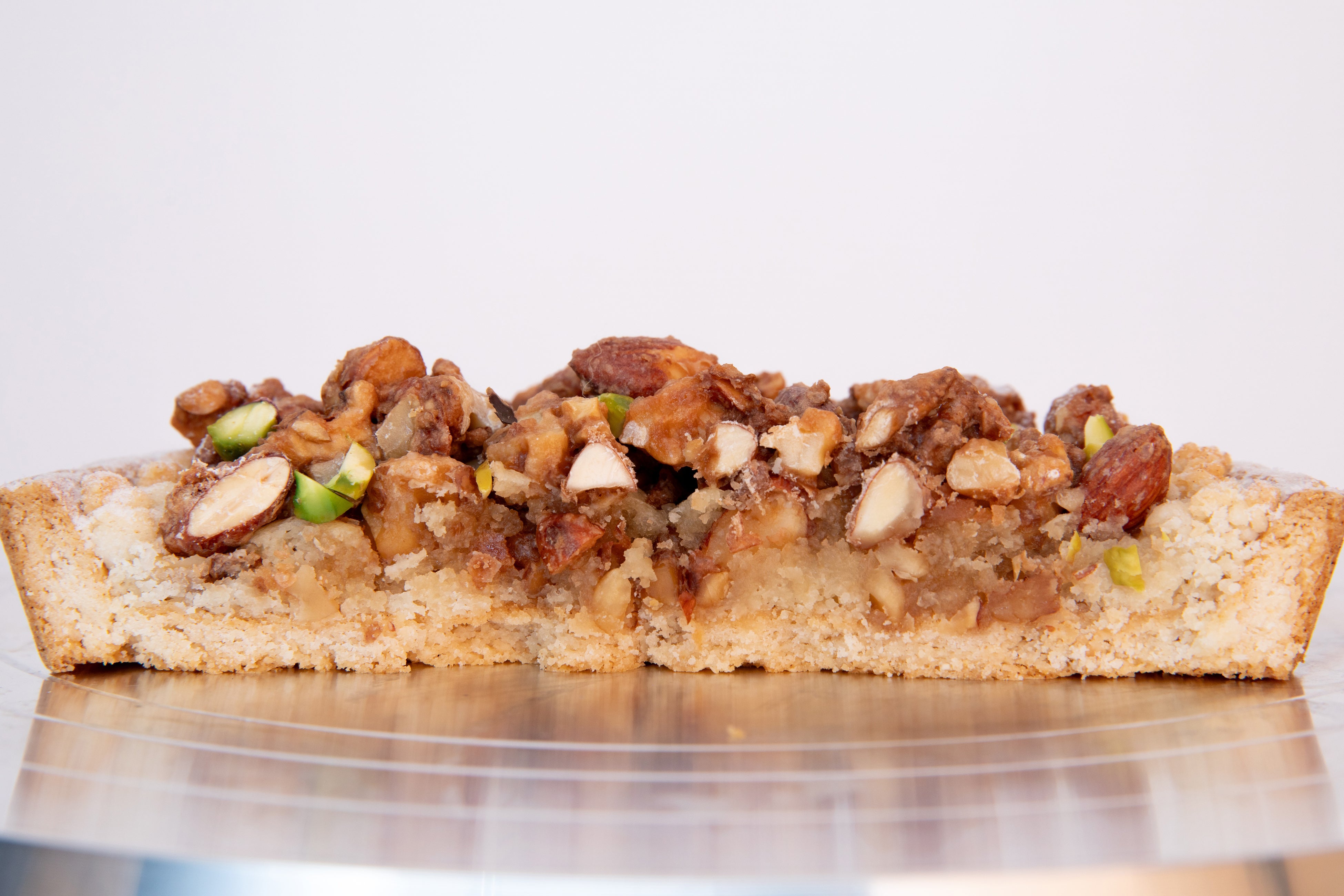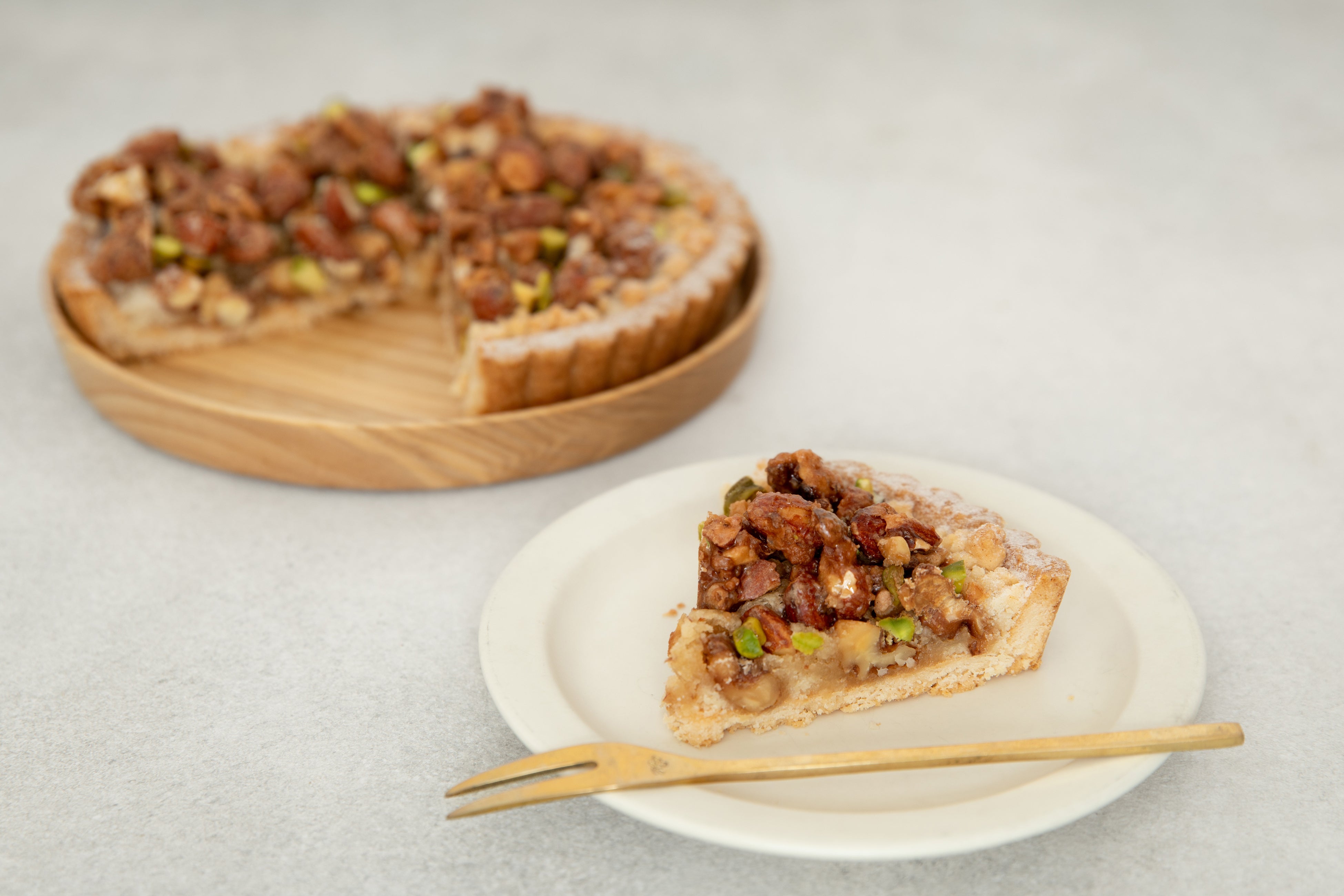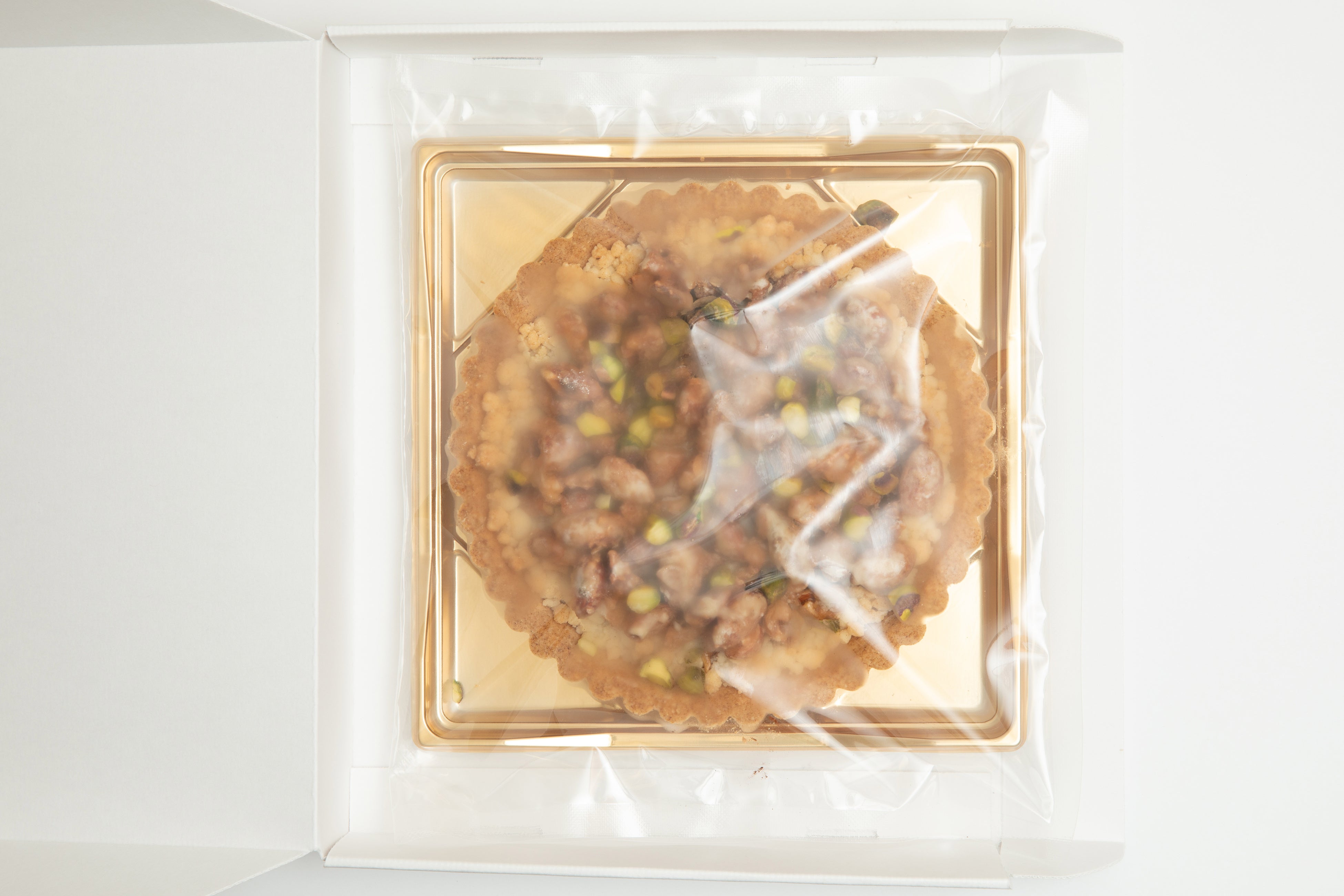 有機米粉やアーモンドプードルをベースにしたサクサクのタルト生地に、オリジナルのクレームダマンドを敷き詰め、有機メープルシロップでキャラメリゼした3種のローストナッツ(アーモンド、くるみ、ピスタチオ)をたっぷりのせて焼き上げました。
