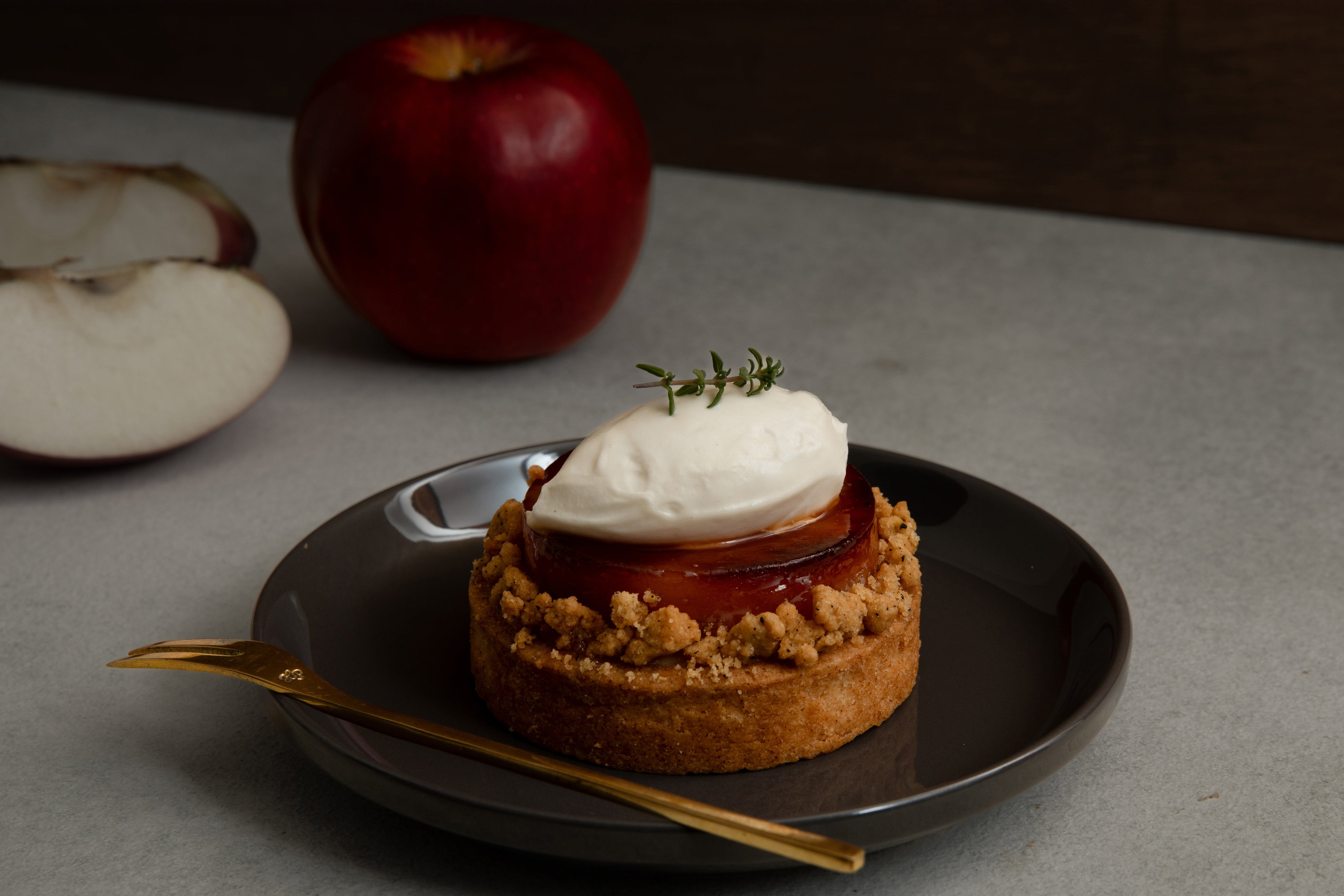 旬の紅玉りんごを有機ココナッツオイルとてんさい糖でキャラメリゼ。ラムとバニラの香りをまとわせて、プラントベースの特製カスタードクリームの上にのせました。アールグレイ茶葉が香るクランブルや、まろやか豆乳ホイップも紅玉の甘酸っぱさを引き立てます。