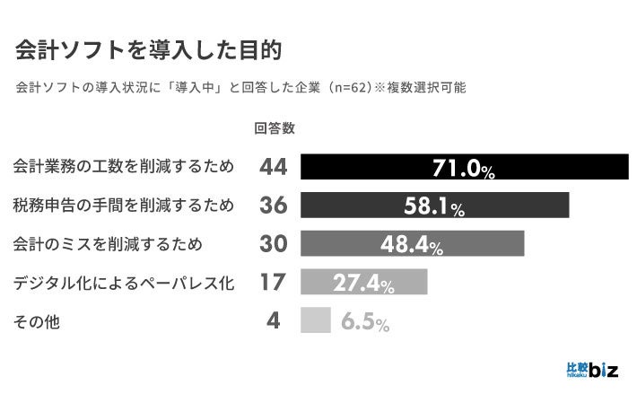 | 会計ソフトを導入した目的 ※複数選択可能 | 「会計業務の工数を削減するため」 71.0% 「税務申告の手間を削減するため」 58.1% 「会計のミスを削減するため」 48.4% 「デジタル化によるペーパレス促進」 27.4% 「その他」 6.5% |