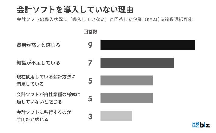 | 会計ソフトを導入していない理由 ※複数選択可能 | 「費用が高いと感じる」 42.9% 「知識が不足している」 33.3% 「現在使用している会計方法に満足している」 23.8% 「自社業種の様式に適していないと感じる」 23.8% 「移行するのが手間だと感じる」 14.3% |