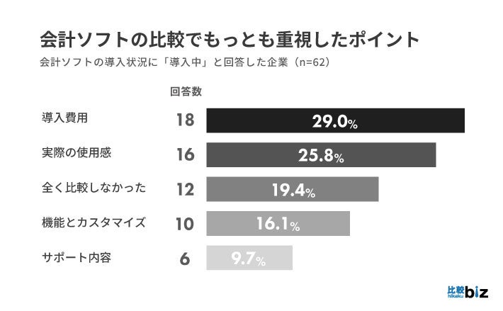 | 会計ソフトの比較で最も重視したこと | 「導入費用」 29.0% 「実際の使用感」 25.8% 「全く比較しなかった」 19.4% 「機能とカスタマイズ」 16.1% 「サポート内容」 9.7% |