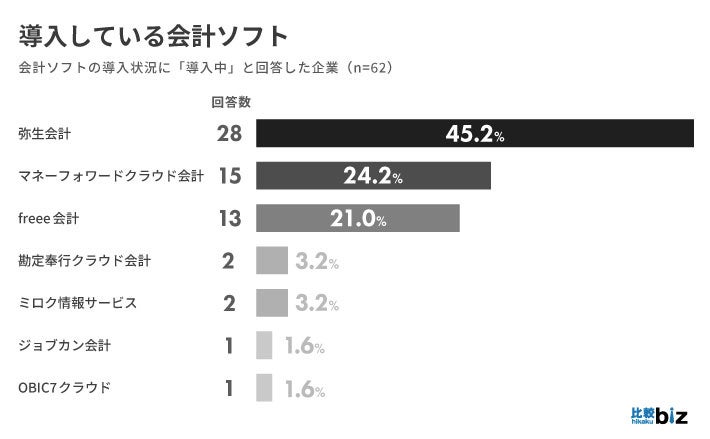 導入している会計ソフトは「弥生会計」が45.2%で1位、続いて「マネーフォワードクラウド会計」「freee会計」という結果に
