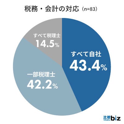 | 税理士への依頼状況 (n=83) | 「すべての業務を税理士へ外注している」 14.5% 「一部業務を税理士へ外注している」 42.2% 「すべての業務を自社で対応している」 43.4% |