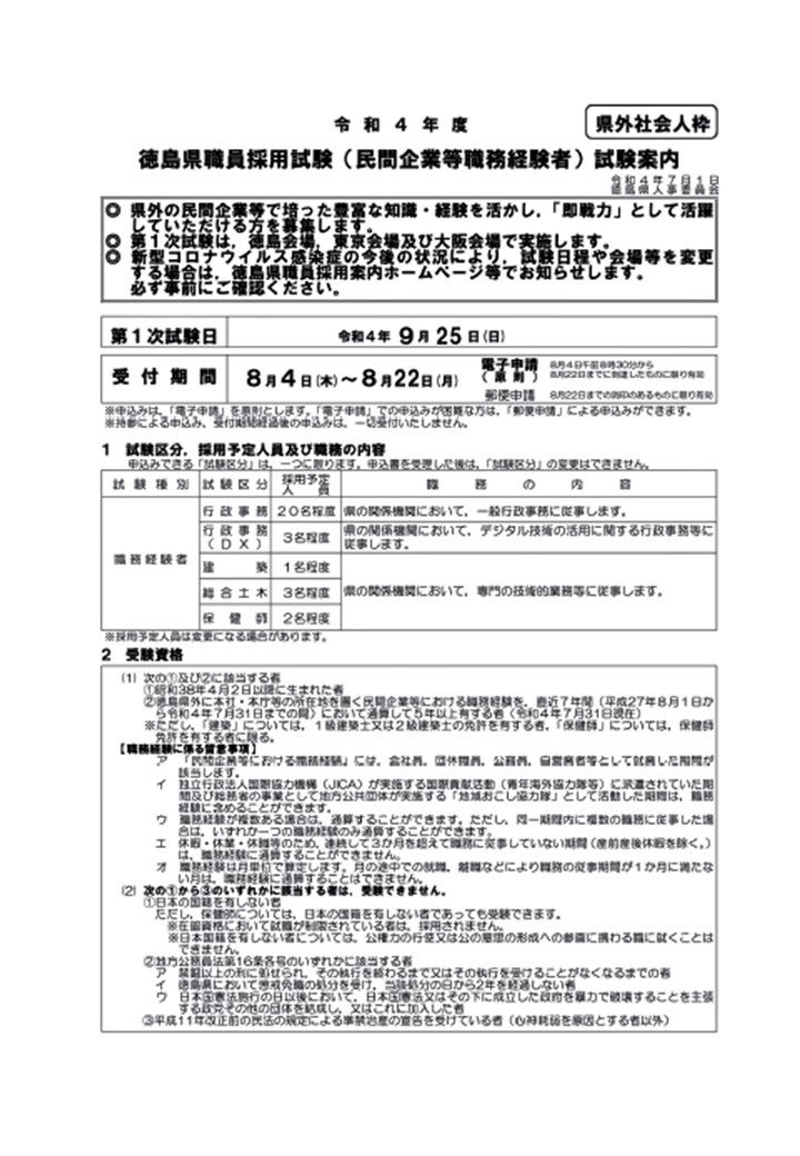 令和4年度徳島県職員採用試験(県外社会人枠)試験案内