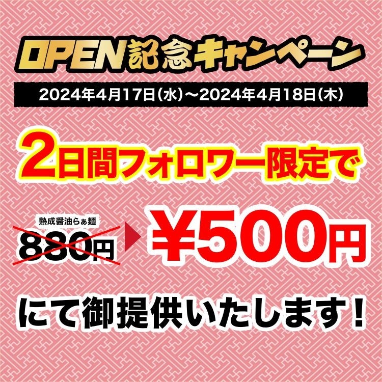 ①Instagram公式アカウントをフォローした方限定で、2024年4月17日(水)〜2024年4月18日(木)の2日間で「熟成醤油らぁ麺(¥880)」をワンコイン500円でプレゼント!