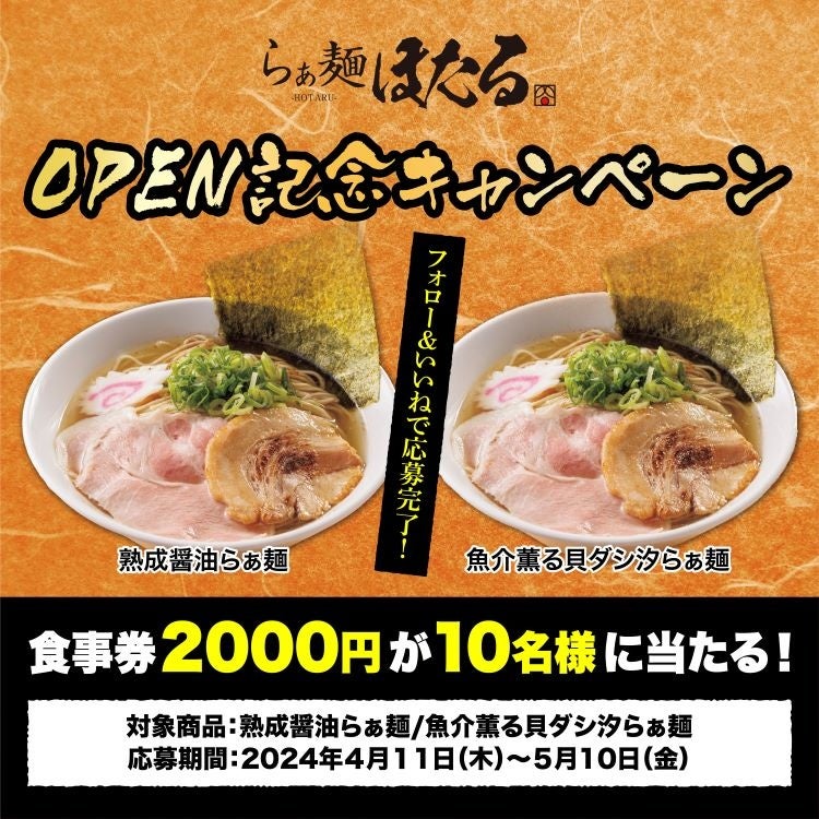 【こだわりのダシが光る、ほたるが贈る至極の中華そば】らぁ麺 ほたる 2024年4月17日(水) NEW OPEN!!