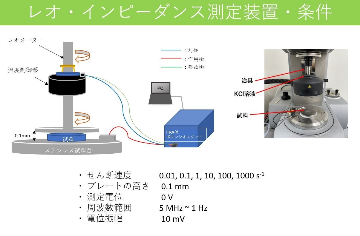 電池材料などに用いられるカーボン分散液(スラリー)にレオメーターでせん断応力を与えながら、粘度と電気化学インピーダンスを測定できる新たな手法を開発しました。