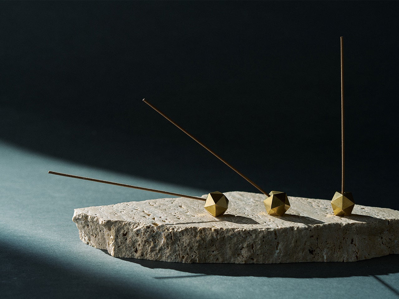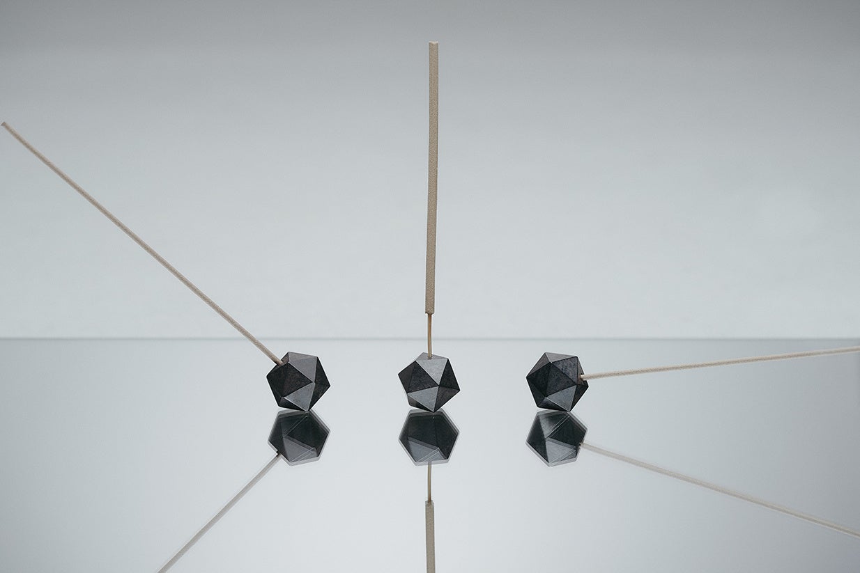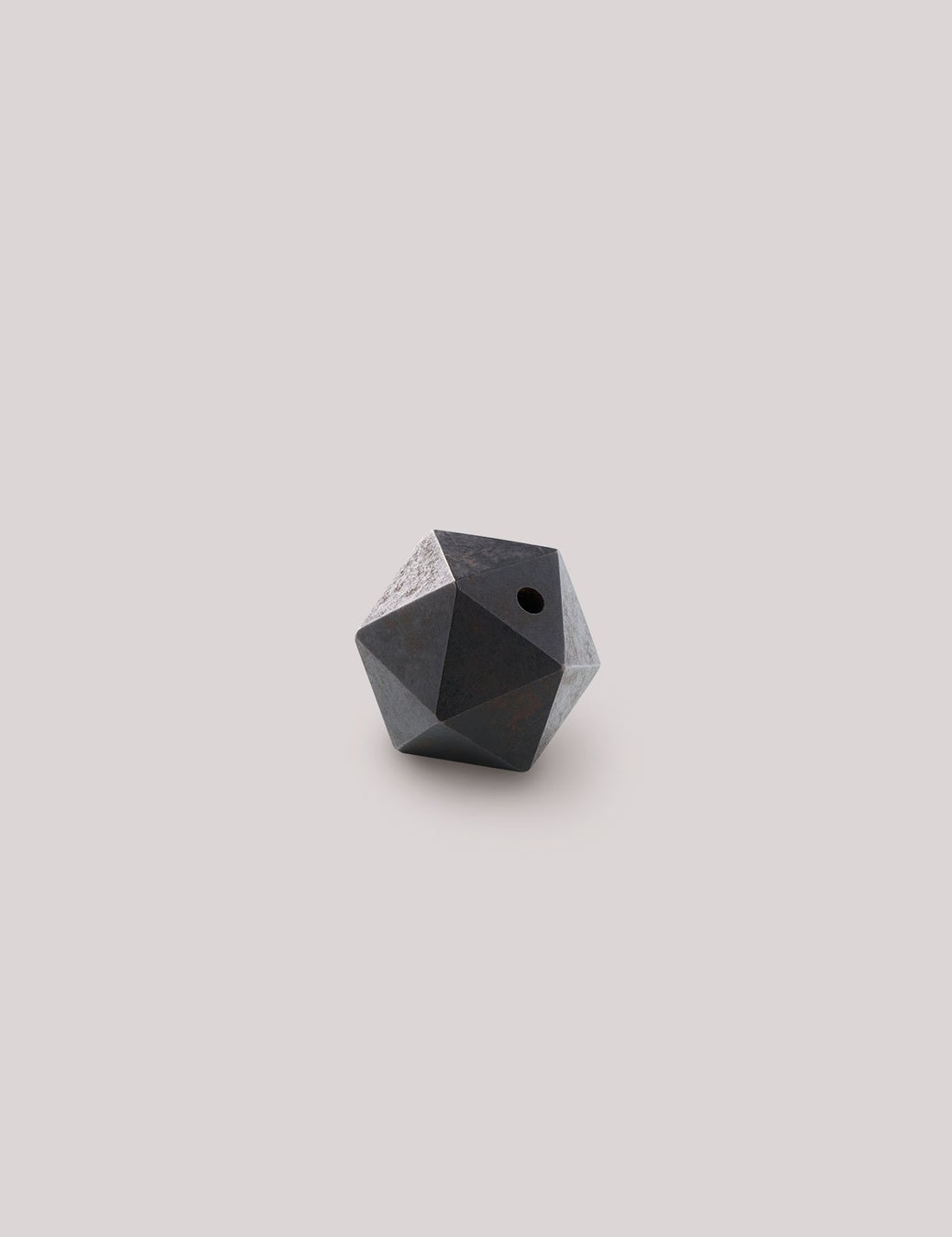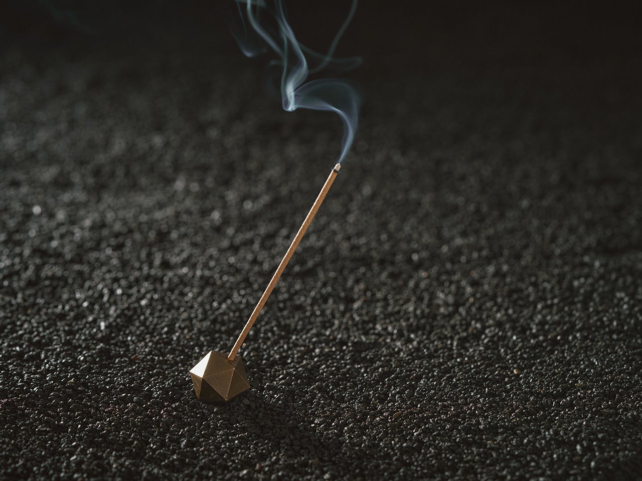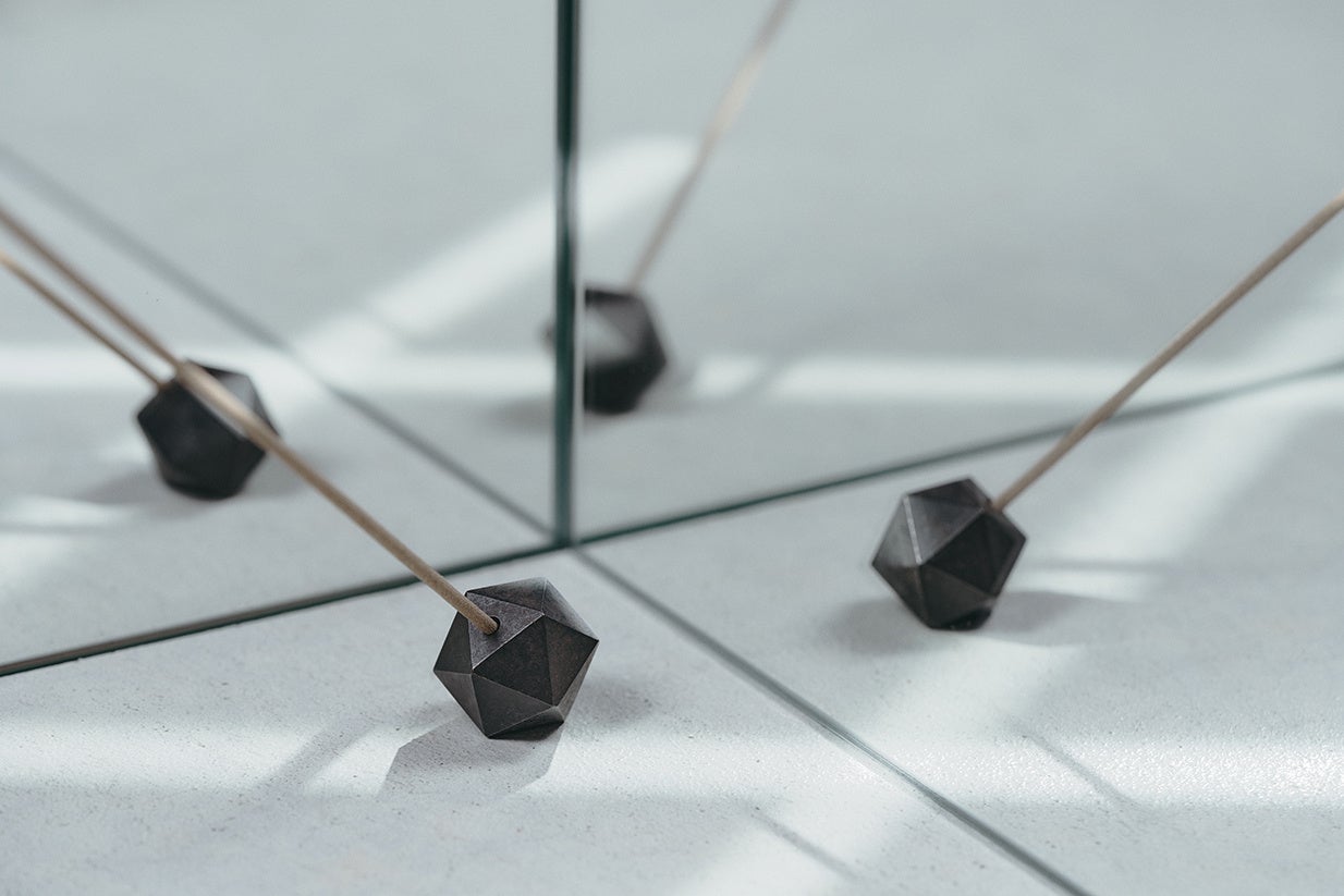 poly incense holder black (ポリインセンスホルダーブラック)は、ダイキャスト鋳造という精度の高い鋳造方法でつくられた真鍮製へ伝統技法による黒色着色を施した香立てです。黒色着色は経年変化により色合いが変化する場合があります、商品の味わいとしておたのしみください。正二十面体のフォルムにより3種の角度でご使用いただけます。(線香、バンブーインセンスなどスティックタイプのお香にご使用いただけます。) 燃え切ると数ミリのお香は燃え残りのヤニによって取れにくい場合がありますが、穴に細い貫通穴が空いているため、反対側からピン等で押し出すことで燃え残り部分を簡単に除去することができます。