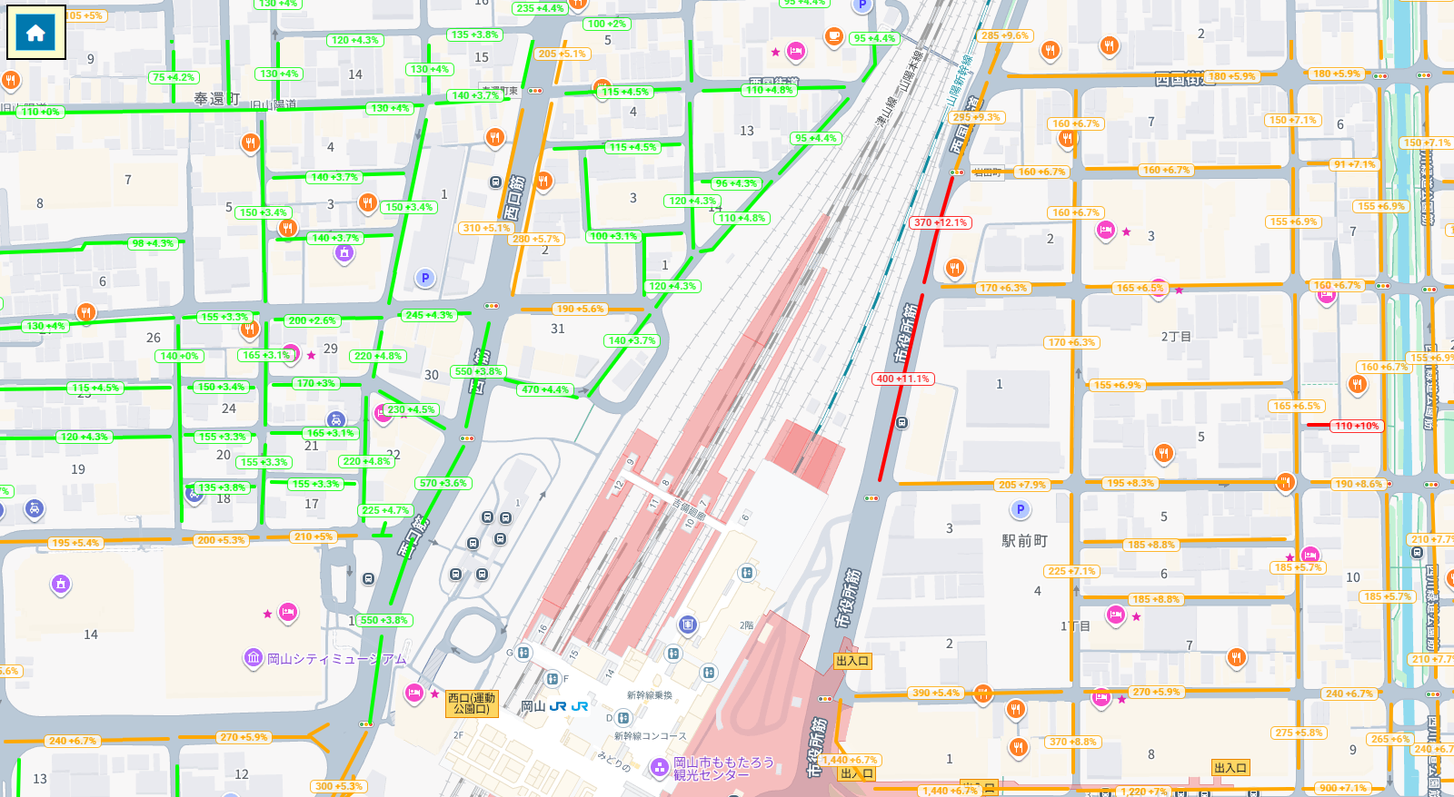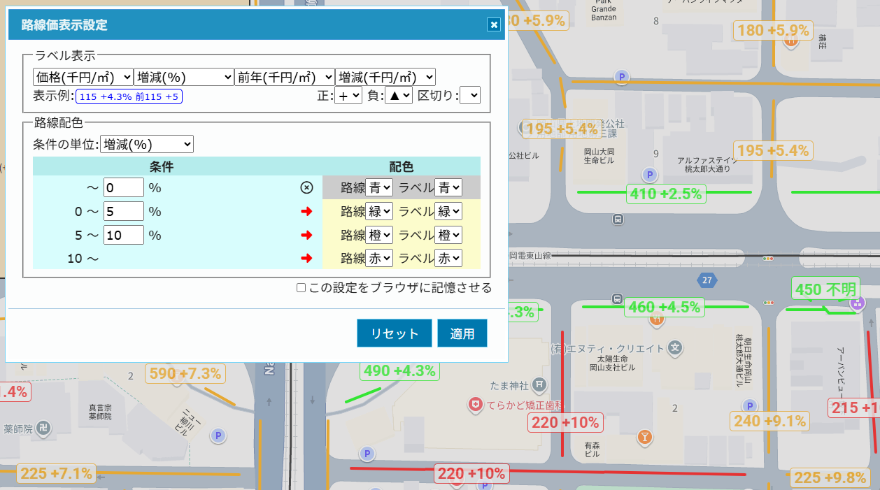 従来は煩雑だった国税庁サイトでの路線価調査を地図上で直感的に行うことが可能になります。さらに、路線価の増減率の表示や、金額別の色分けなども可能になります。