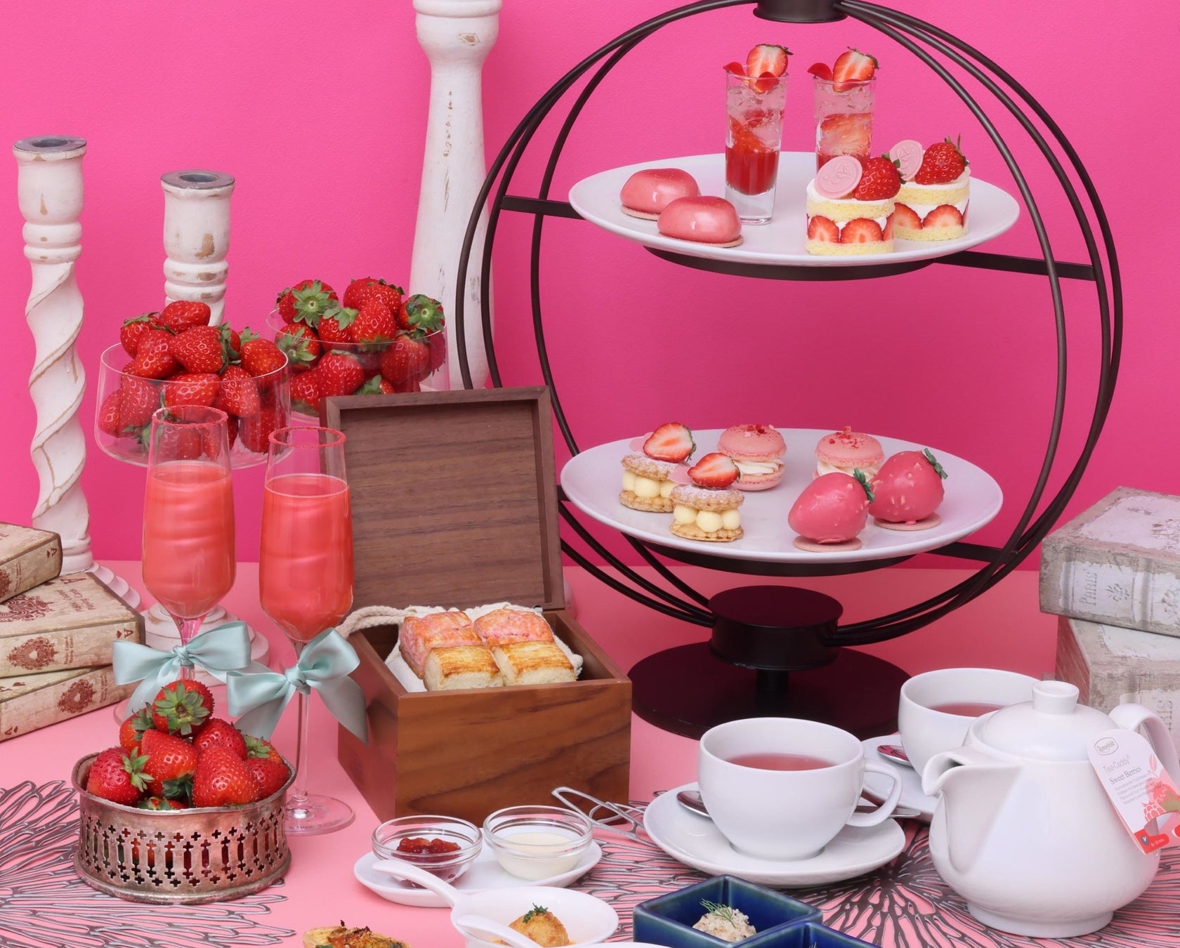 甘くてジューシーないちごをたっぷり使ったスイーツとオトナかわいい雰囲気が融合したアフタヌーンティー。上品なスタイルと色調でエレガントさを演出し、ハートやいちごを模ったスイーツで遊び心をプラスしました。