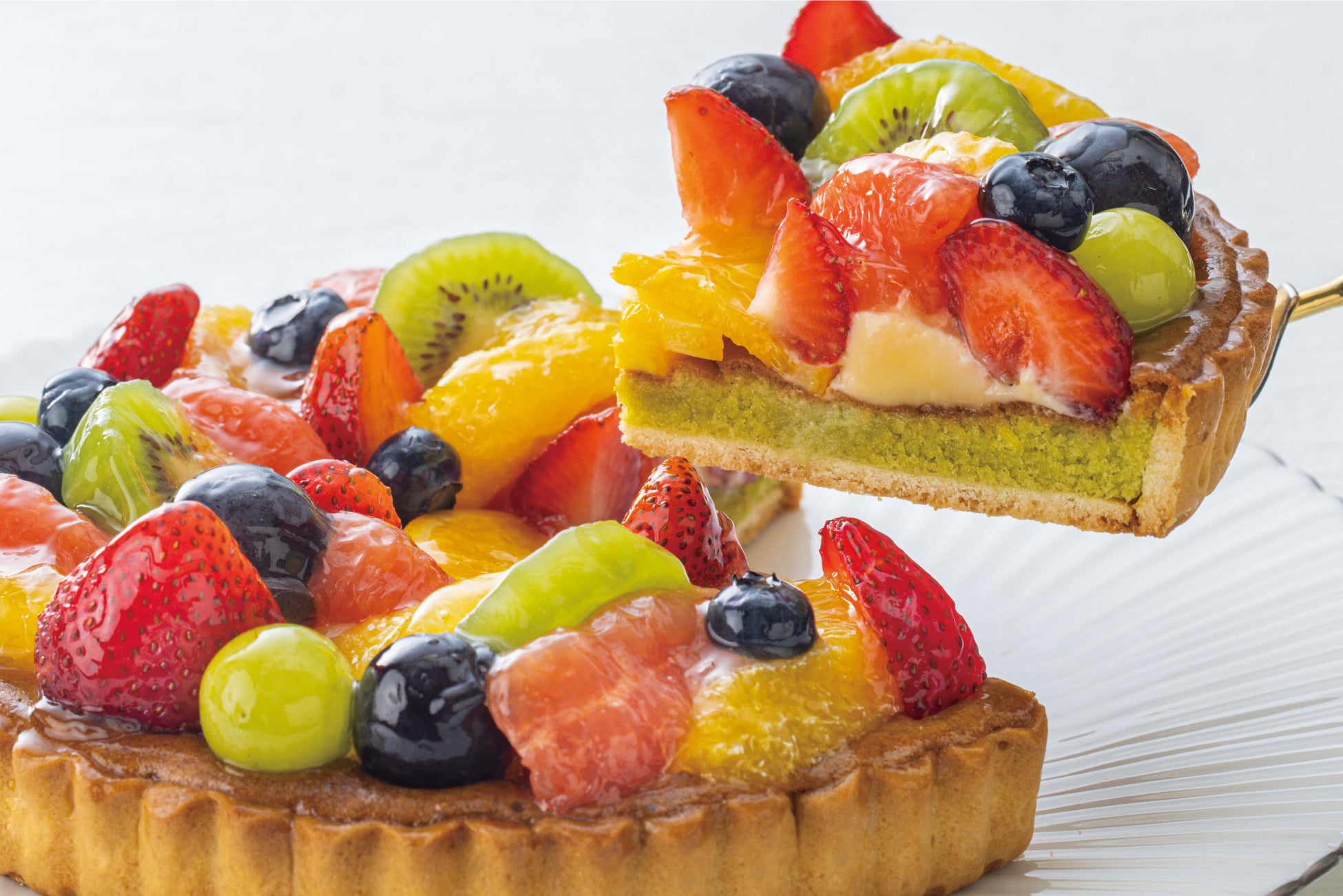 ピスタチオを使用したダマンドタルト台に、カスタードクリームと7種のフルーツをクリスマスリースのように飾りました。