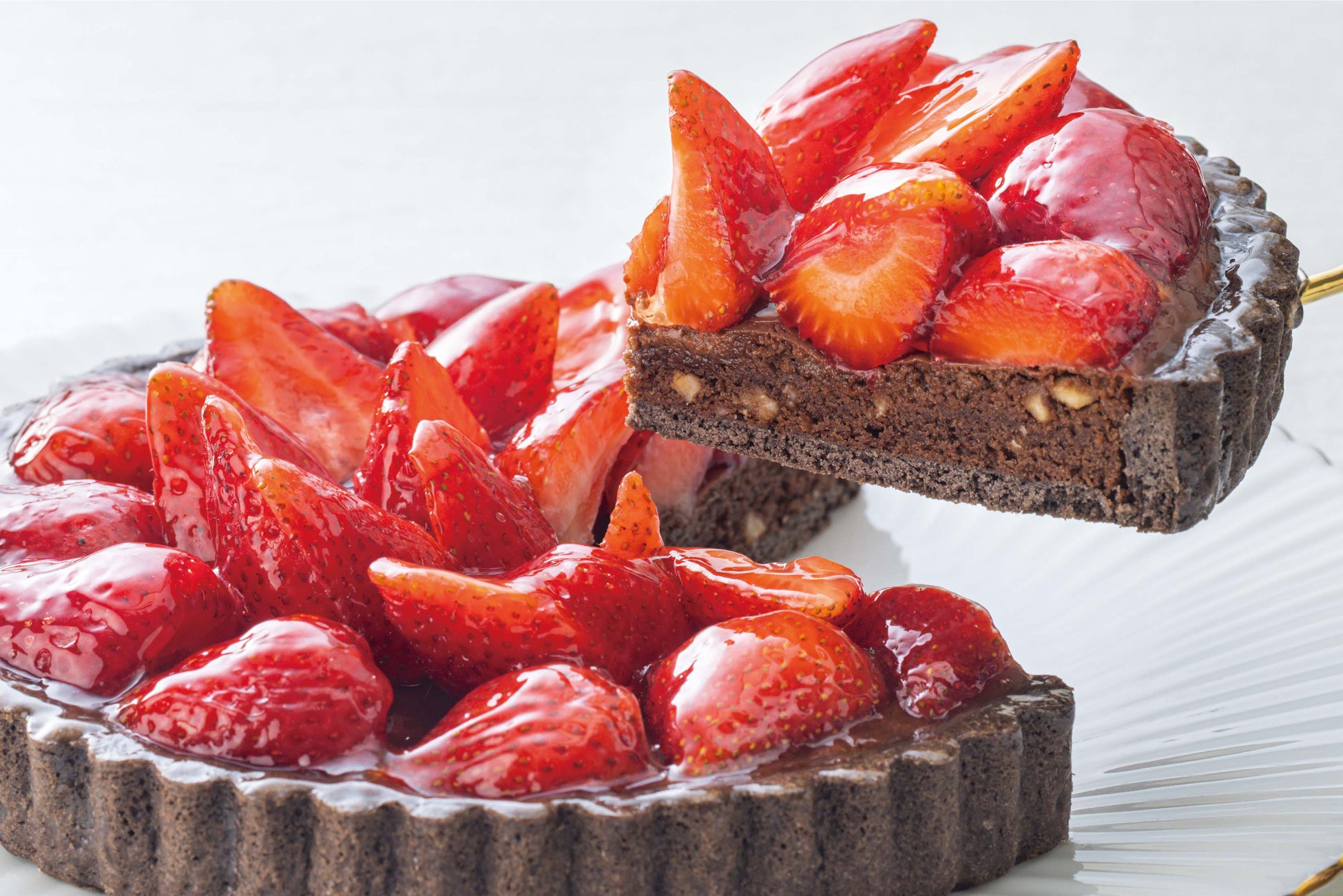 ココアのシュクレ生地にヘーゼルナッツ入りのショコラダマンドクリームを入れて焼き上げたタルトに、あまおう苺を贅沢に飾りました。