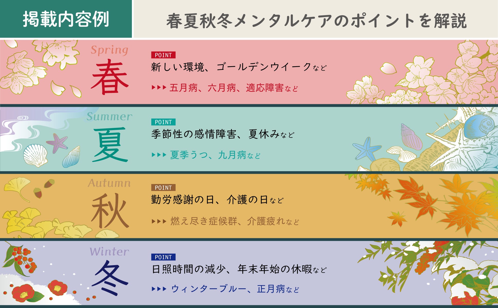 たとえば、冬季や夏季といった決まった時期に気分が落ち込む「季節性感情障害」や、ゴールデンウィーク明けに不調を覚える「五月病」をはじめ、季節の移り変わりに合わせて、メンタルヘルスの観点から知っておきたいポイントを詰め込んでいます。