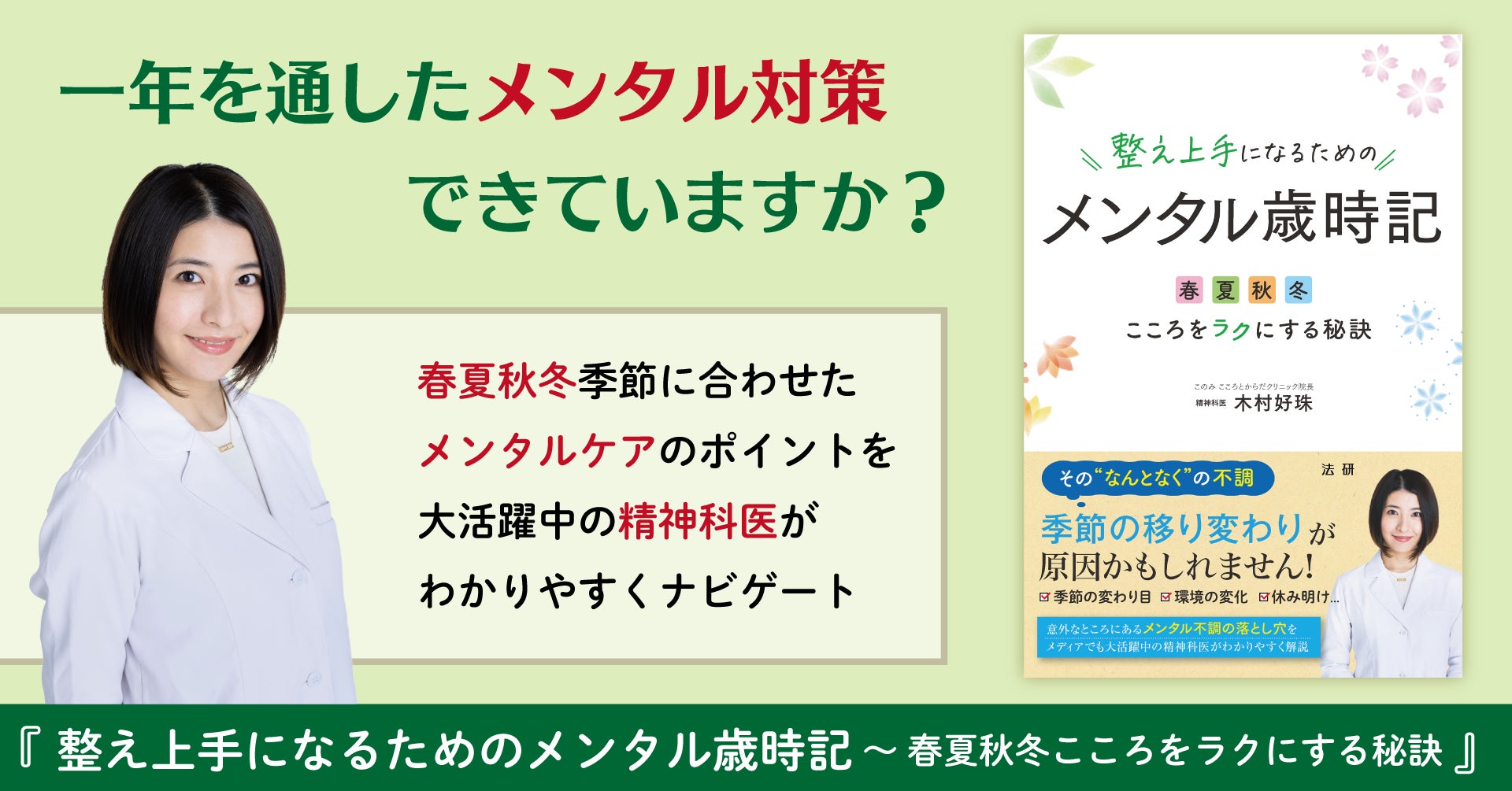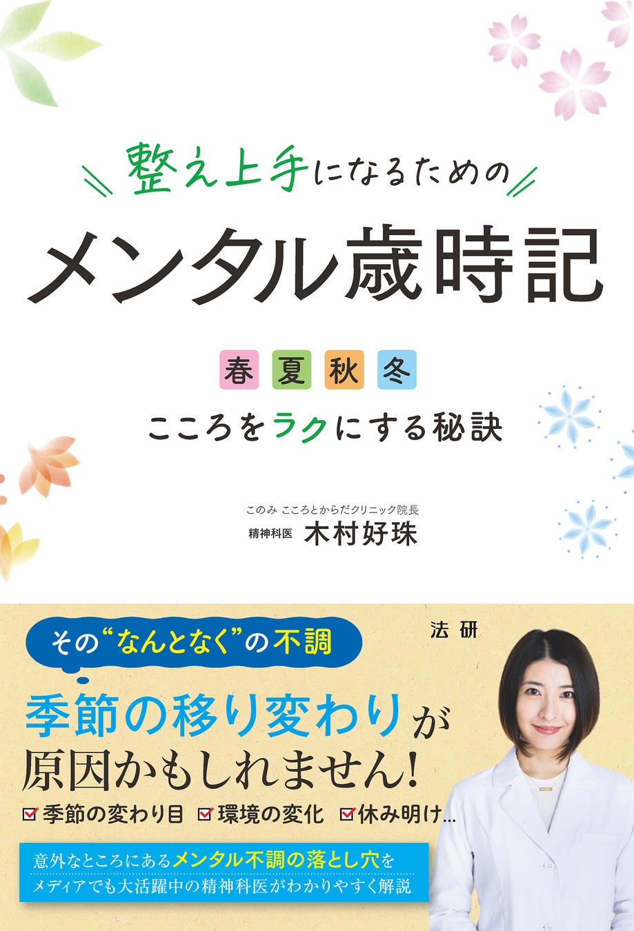 株式会社法研(本社:東京都中央区、代表取締役社長:東島俊一)は、各種メディアでも大活躍中の精神科医・木村好珠先生による書籍『整え上手になるためのメンタル歳時記 ~ 春夏秋冬こころをラクにする秘訣』を2025年4月12日より発売いたします。