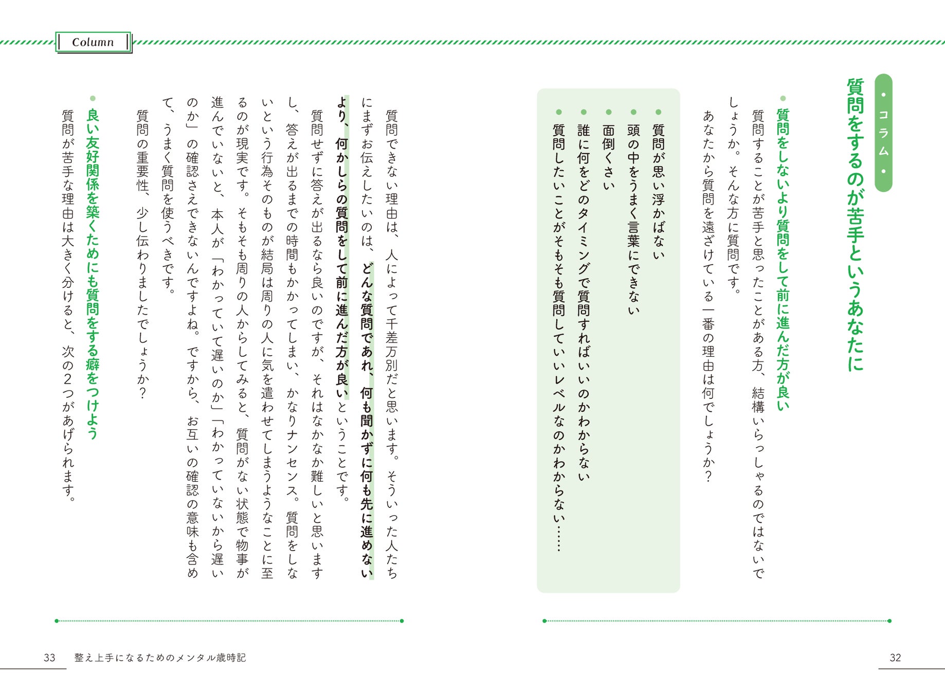 季節ごとに取り上げるすべてのテーマに、コラムの形でプラスアルファの情報を掲載し、内容に厚みを持たせているところもポイントです。たとえば、環境の変化に馴染めないときに陥りがちな「適応障害」の解説では、そのセットとして「質問が苦手というあなたに」というコラムを掲載しています。これにより、適応障害への理解が深まるとともに、集団の中での質問の活用法がわかり、コミュニケーションが改善されることで、集団に馴染みやすくなることが期待できます。