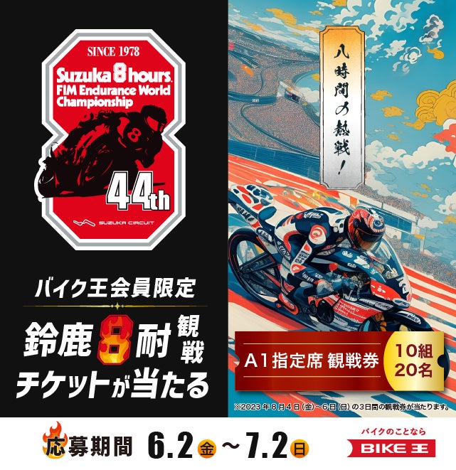 ① バイク王会員限定(無料)で専用フォームよりご応募いただいた方の中から抽選で10組20名様に鈴鹿8時間耐久レースのA1指定席観戦券をプレゼント ② Twitterにて当社アカウント(@bikelifelab)をフォロ―&該当ツイートをリツイートいただいた方の中から抽選で3組6名様に鈴鹿8時間耐久レースのA1指定席観戦券をプレゼント ※詳細は下記の特設サイトにてご確認ください。 |
