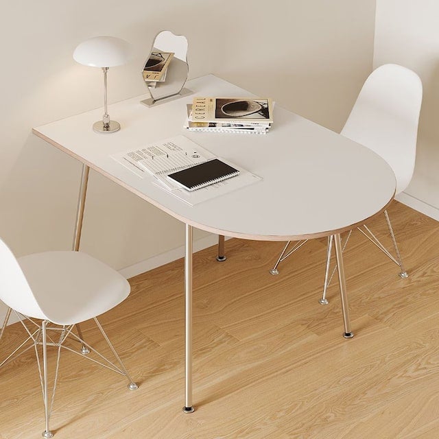大きすぎず小さすぎず2人で使うには丁度いい大きさでした。天板が白、脚がスチールのテーブルは中々売ってないので、求めていたデザインでした。値段もお手頃価格で片方は壁付けできるので省スペースで部屋の動線もスムーズです。