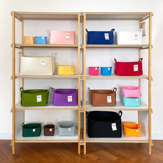 フェルト素材のやさしい風合いと、見ているだけで楽しくなる豊富なカラー&サイズ展開。しっかり自立する作りで、子ども部屋やリビングでも使いやすく、収納アイテムとしても優秀です。ミニサイズは卓上の小物入れにもぴったり。
