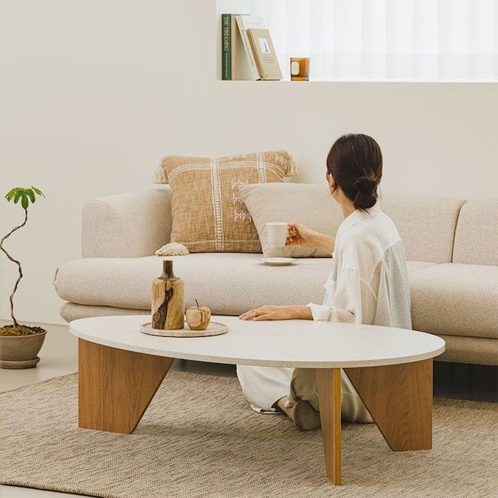 やわらかな曲線を描く天板と、さりげなく個性が光る脚のデザインが魅力のローテーブル。あえて真っ白ではなく、ニュアンスのある質感の天板もポイントです。一人暮らしに使いやすいLサイズと、複数人で囲めるXLサイズの2種類があります。