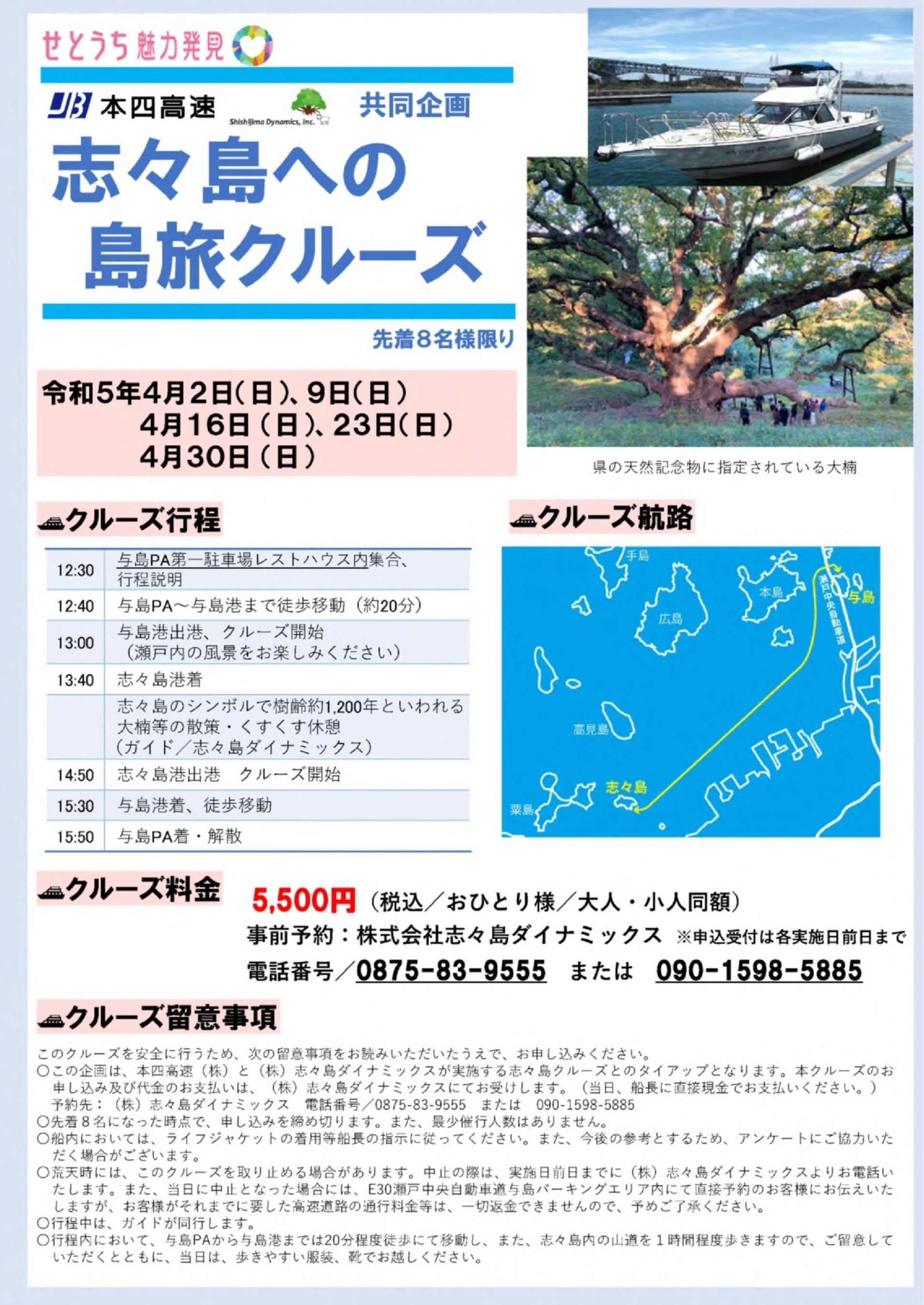 JB本四高速では、塩飽諸島を中心とする魅力発見・発信による観光振興、交流人口の増大を目指した島旅の取組みの一環として、株式会社志々島ダイナミックスとの共同企画による、香川県坂出市の与島港から香川県三豊市の志々島への島旅クルーズを実施します。