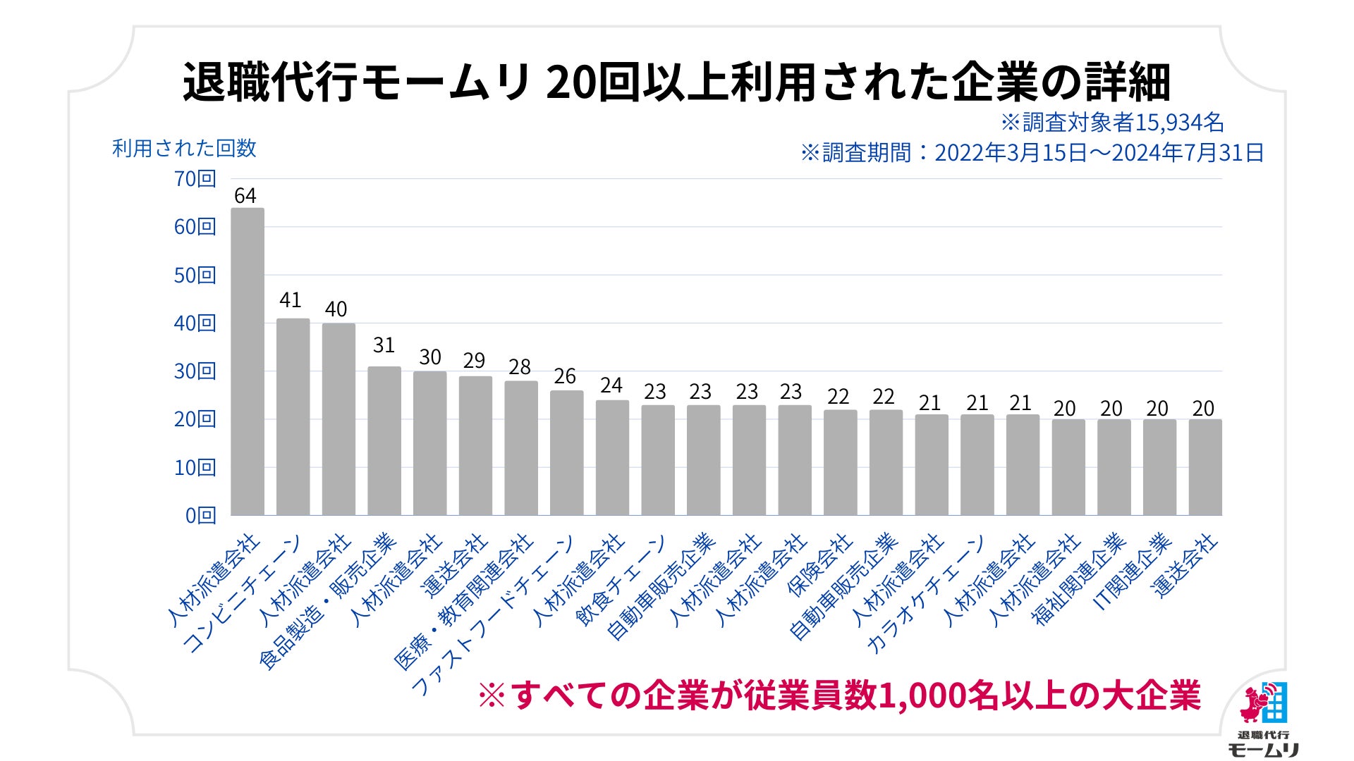 1番多い企業でなんと64回も退職代行モームリの利用がありました。