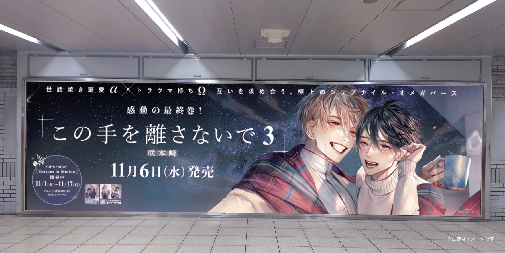 『この手を離さないで』(著:咲本﨑)シリーズ最終巻となる第3巻が、11月6日に電子・紙コミックス同時に発売いたします。本作品の完結を記念して、本日から11月10日まで、JR池袋駅北口改札前に大型交通広告を展開。“はるみや”の描き下ろしイラストが大きく掲出されています。