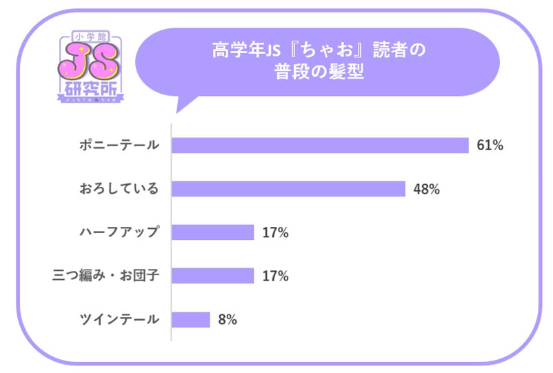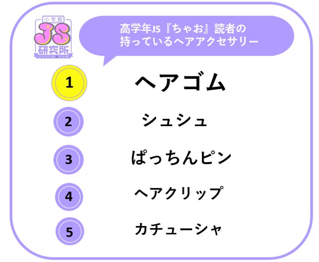 今回は、低学年JSが中心の『ぷっちぐみ』読者700名と、高学年JSが中心の『ちゃお』読者1000名を対象に、「ヘアトレンド」に関する調査を実施。普段のヘアアレンジや持っているヘアアクセサリーなど、”ヘア”に関するイマドキJSのおしゃれトレンドを発表いたします。
