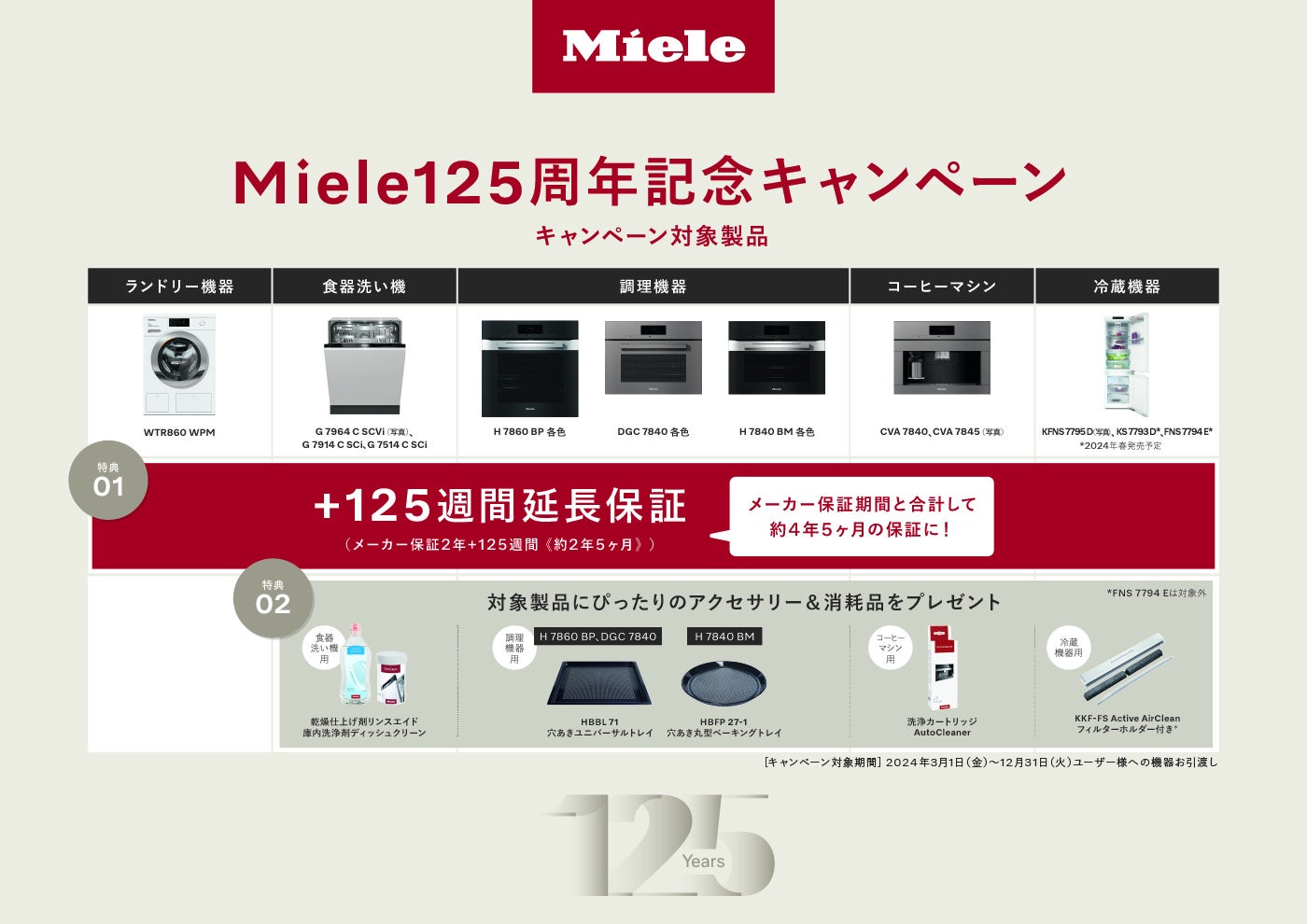 「Miele125周年記念キャンペーン 125 years of quality.」は日本では、2024年3月1日(金)〜12月31日(火)の期間*、対象製品を購入された方々に、メーカー保証2年に追加して125週間(合計約4年5か月)の延長保証をプレゼントいたします。(*対象期間までにユーザー様へ機器お引渡し)また、キャンペーン対象製品によっては、製品を長くお使いいただくための洗剤やアクセサリーのギフトも進呈いたします。