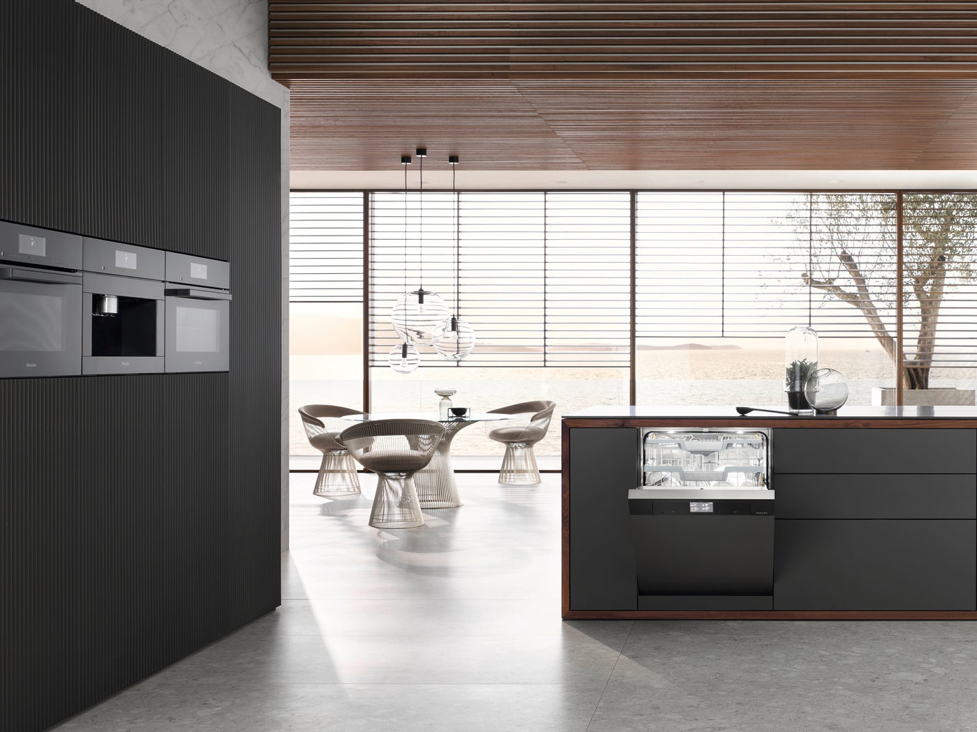 はアプリの「洗濯アシスタント」で洗うものをチェックしながら最適なプログラムを選んでスタート。食後の片付けは食器洗い機におまかせ。Miele製品でトータルコーディネートすると、便利で快適に、より充実した毎日に変わります。