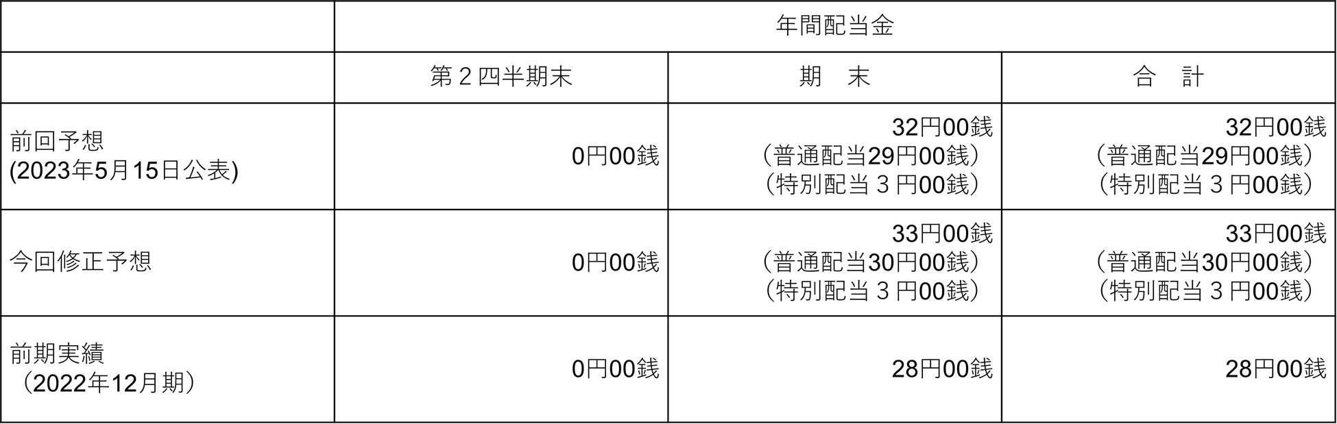 この基本方針のもと、上記業績予想の修正を踏まえ、2023年12月期の期末配当金(普通配当)につきましては、1株当たり29円から30円に修正いたします。株主優待廃止に伴う3円の特別配当と合わせて、年間配当は33円となる予定です。