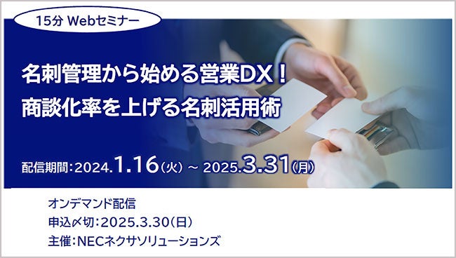 NECネクサソリューションズは、4月までオンデマンド配信していた「【15分Webセミナー】名刺管理から始める営業DX!商談化率を上げる名刺活用術」を、好評につき視聴期間を2025年3月31日(月)まで延長します。