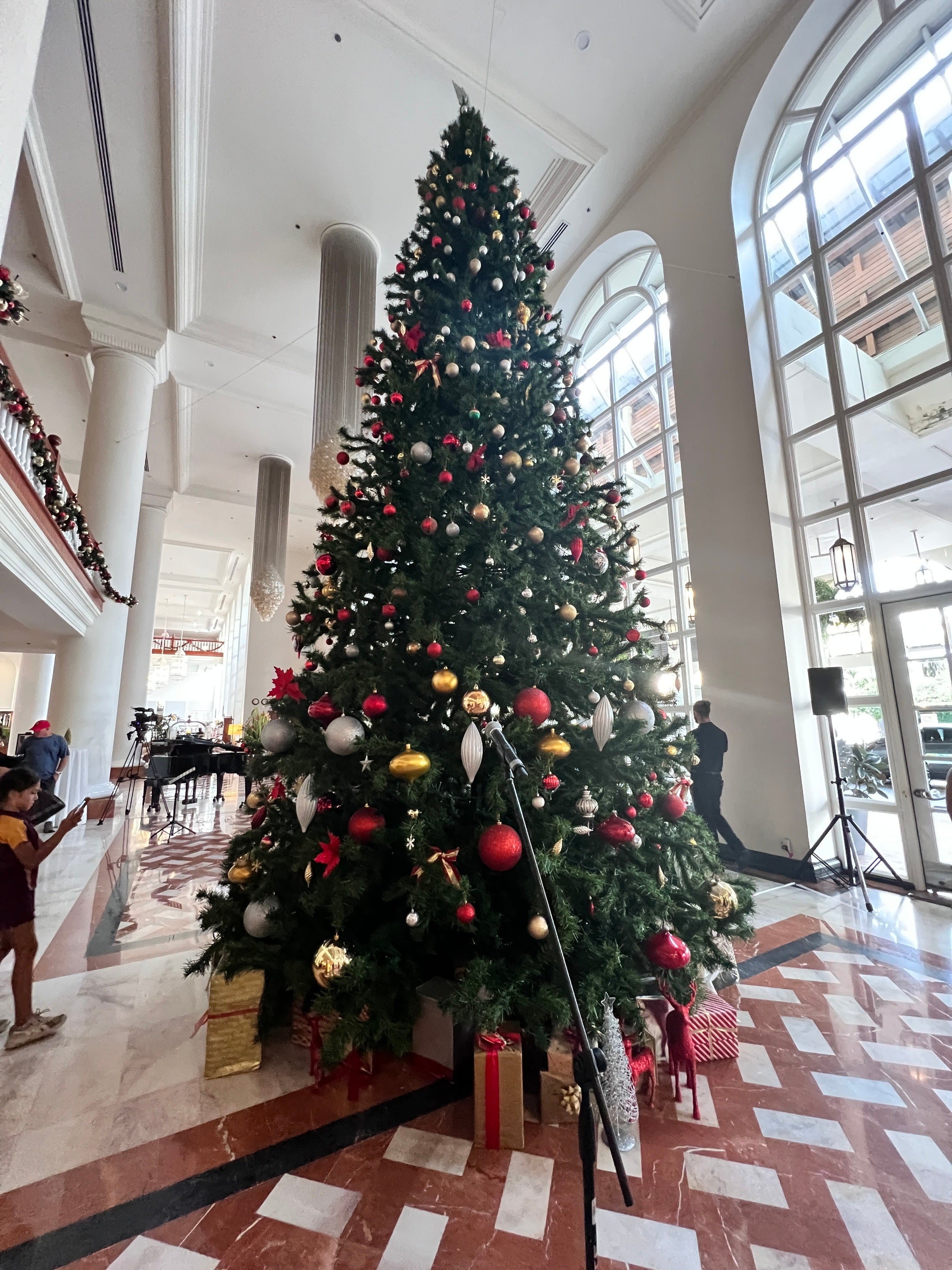 (右)【プルマン ケアンズ インターナショナル】 白を基調としたコロニアル調のロビーには開放的な吹き抜けがあり、高い天井から飾られるシャンデリアも印象的な5つ星ホテルでは、入口を入ってすぐ、豪華なクリスマスツリーが迎えてくれます。