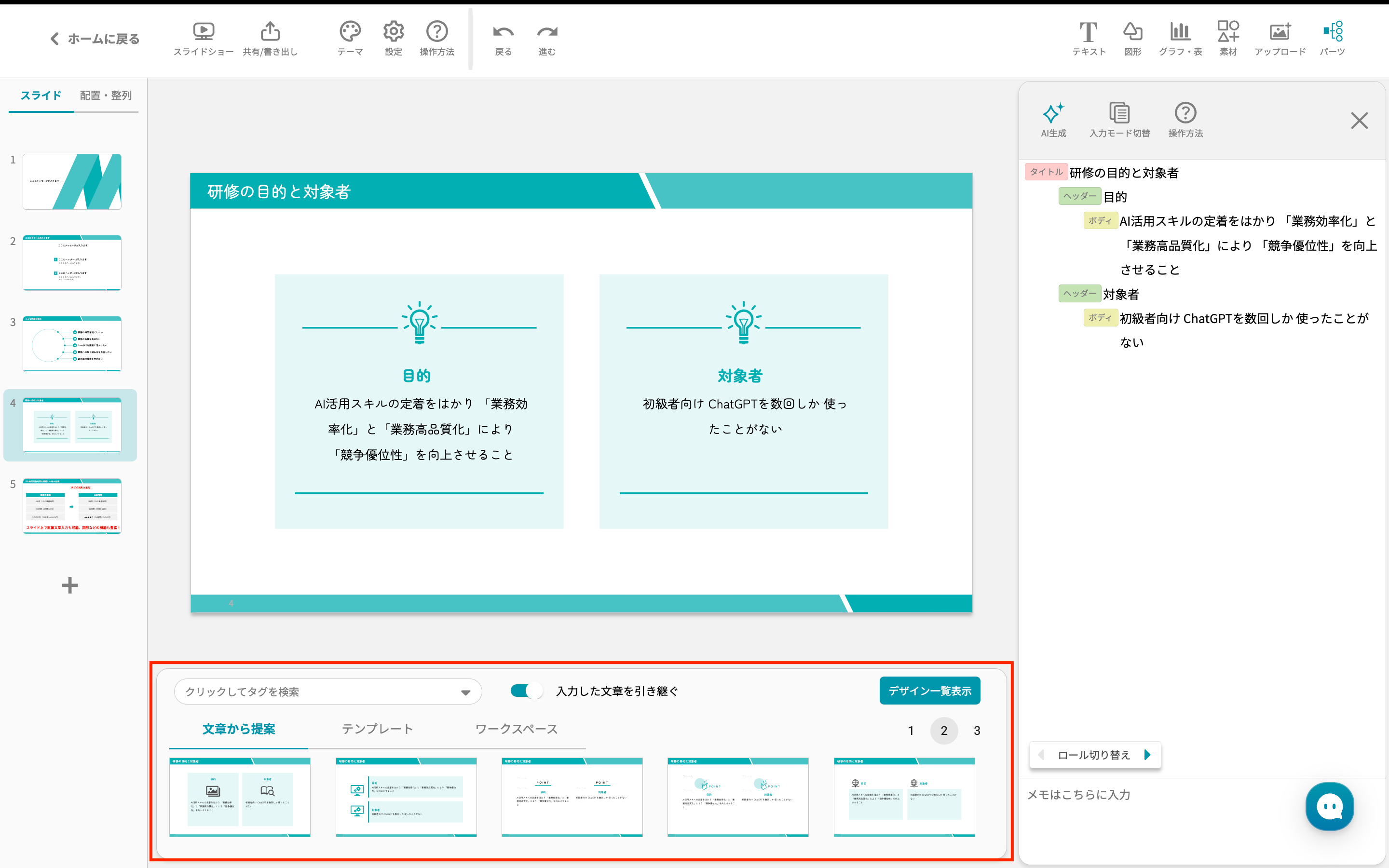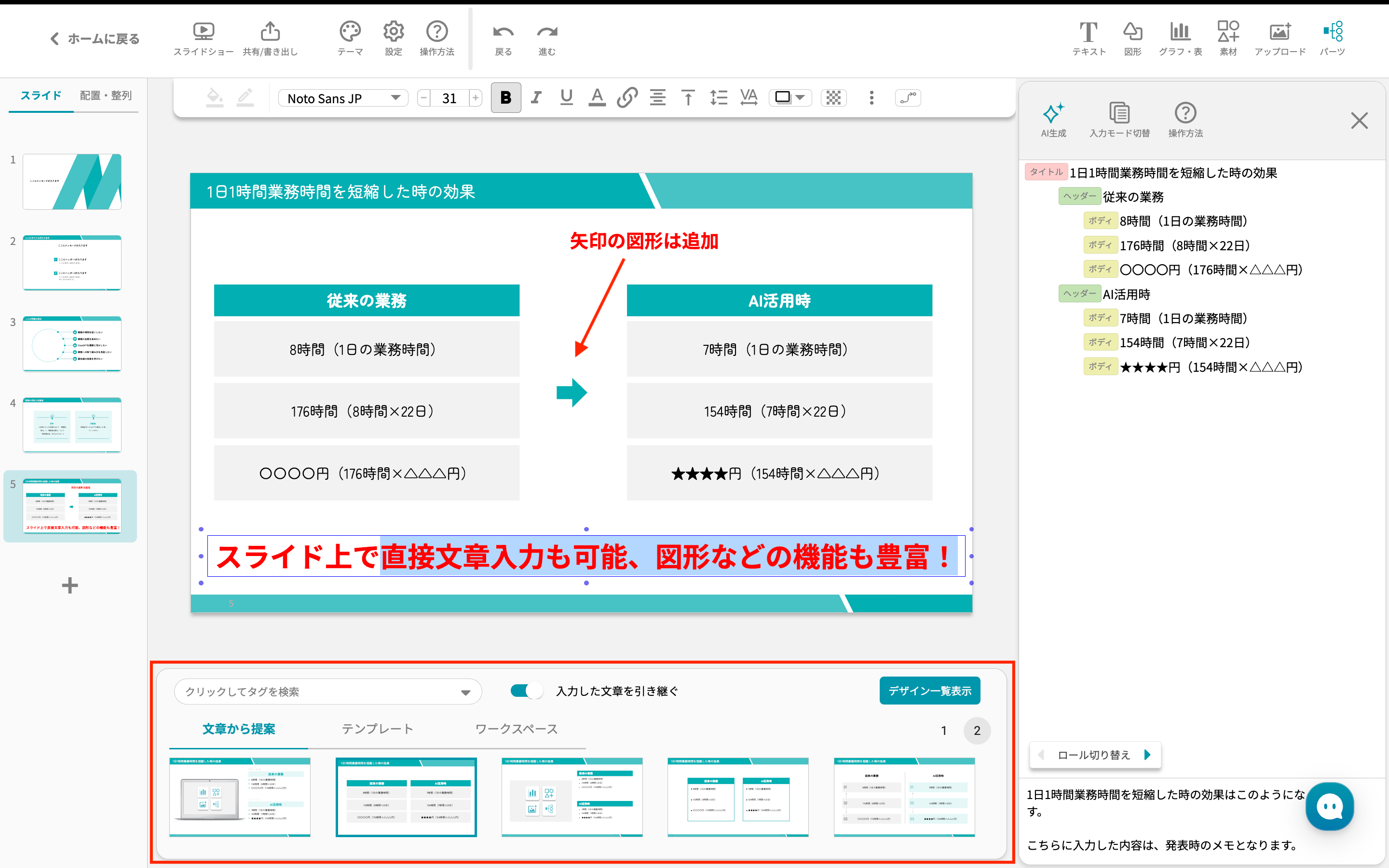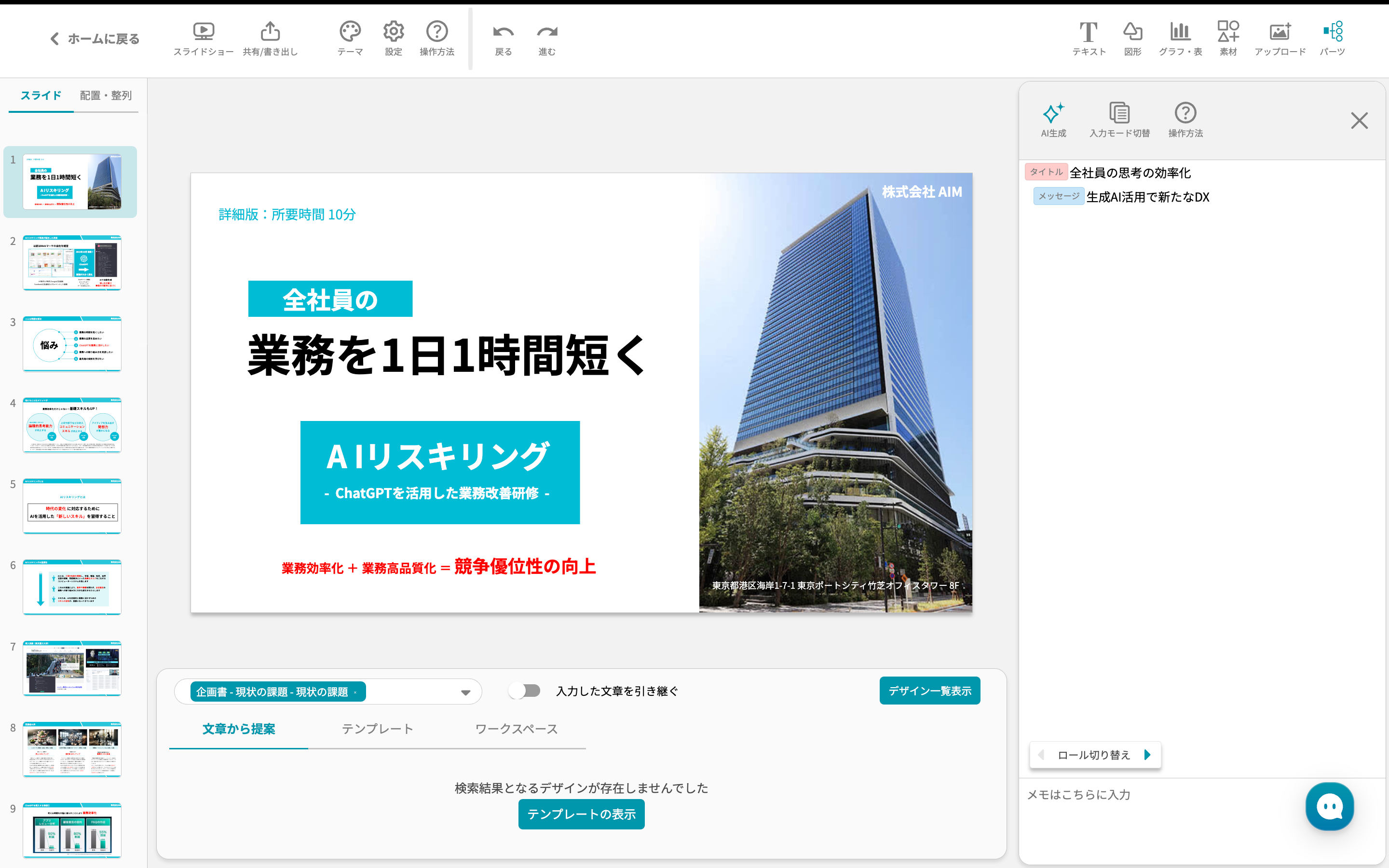 タイトルやポイントとなるテキストを入力すると、AIが自動で文章とスライドを作成し、