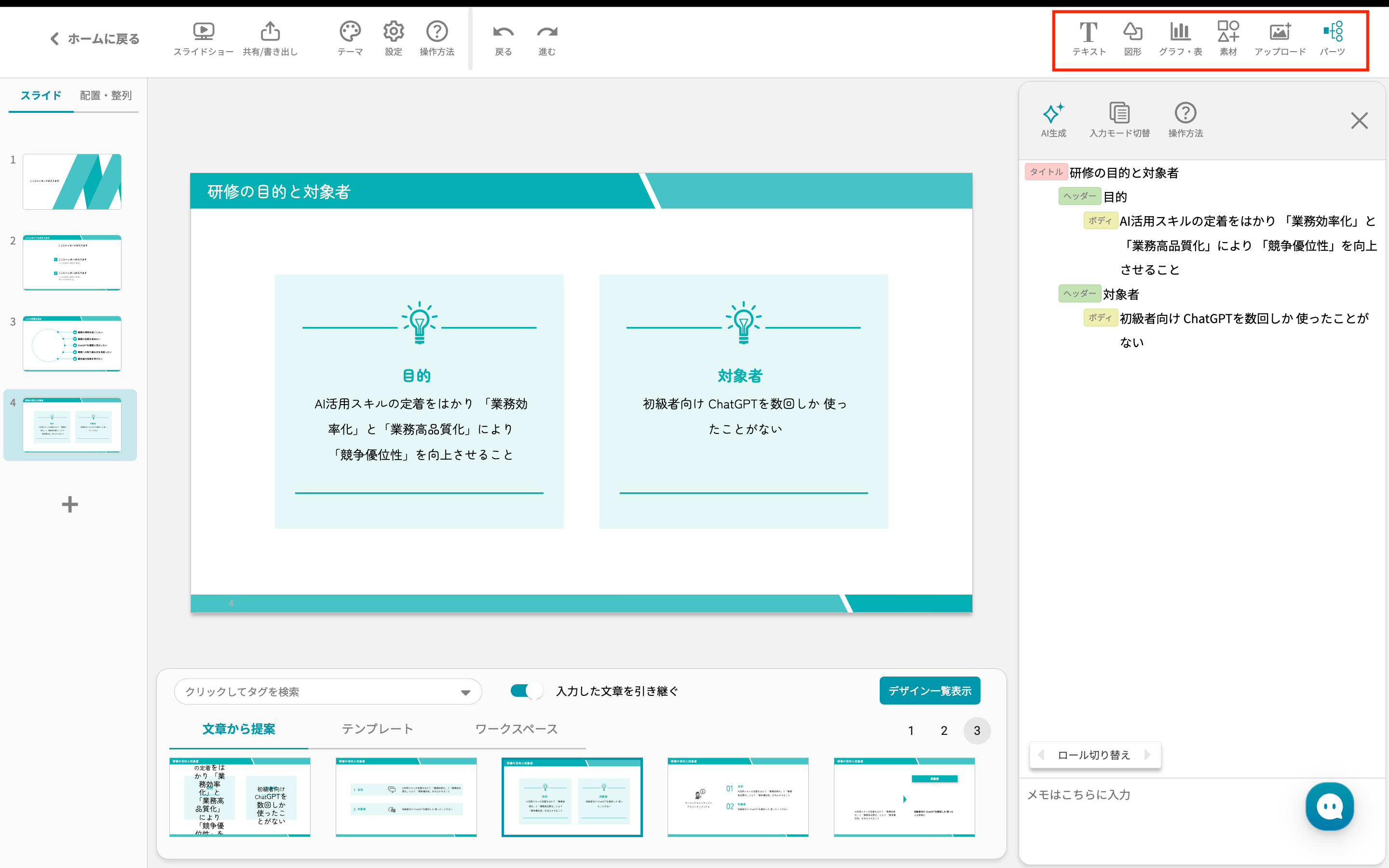 作成したスライドへテキストや図形、グラフを挿入したい時は、作業画面上部のボタンを押すことで可能です。