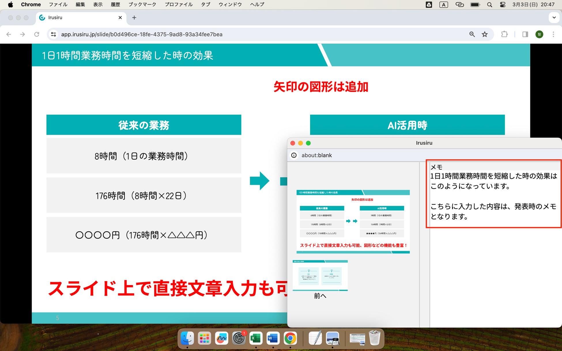 ※「イルシル」のおすすめの使い方パート2では、GoogleドキュメントやWordなどのメモから資料全体をAIに生成させる使い方を紹介しておりますので、合わせてご覧ください。